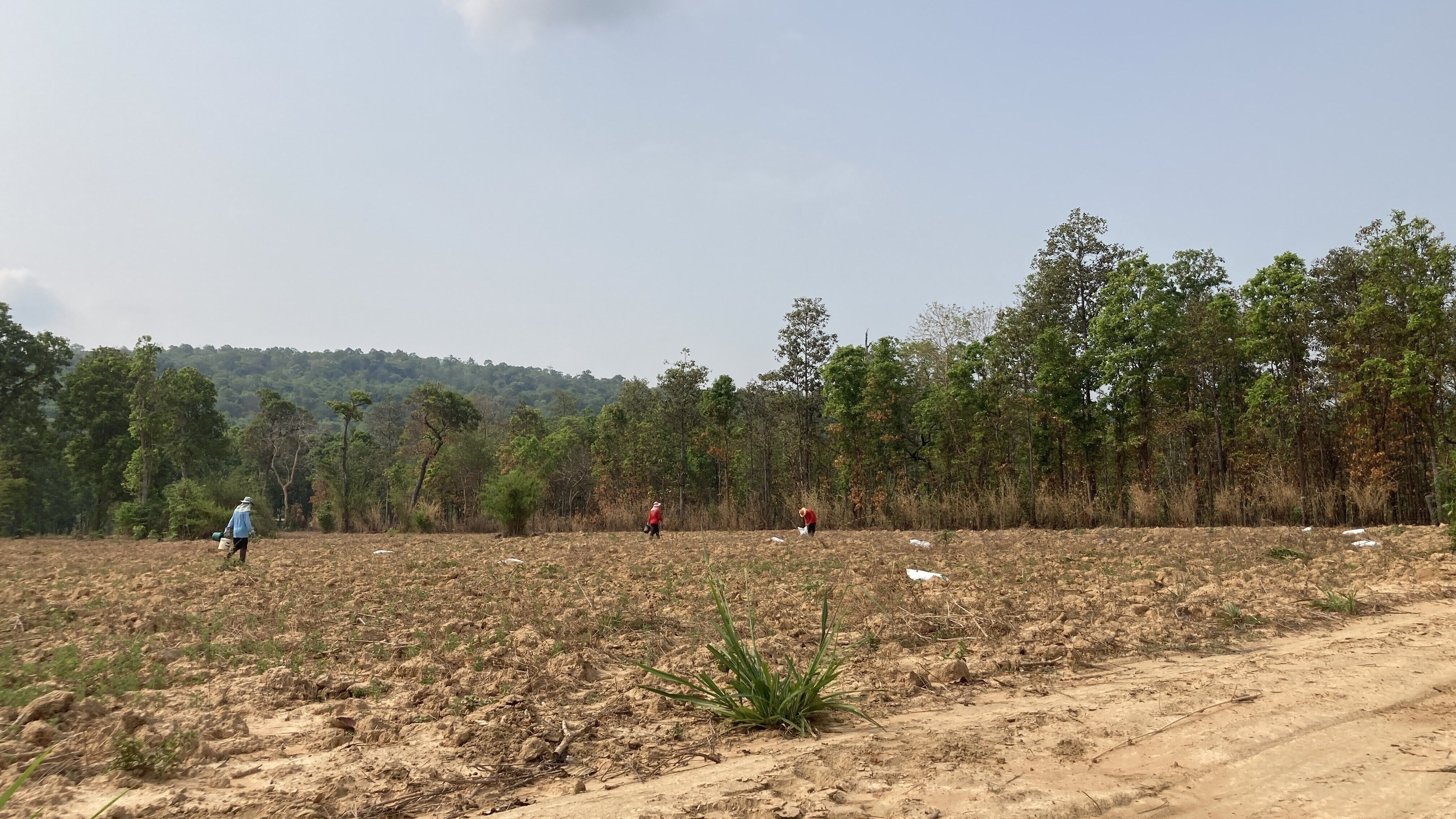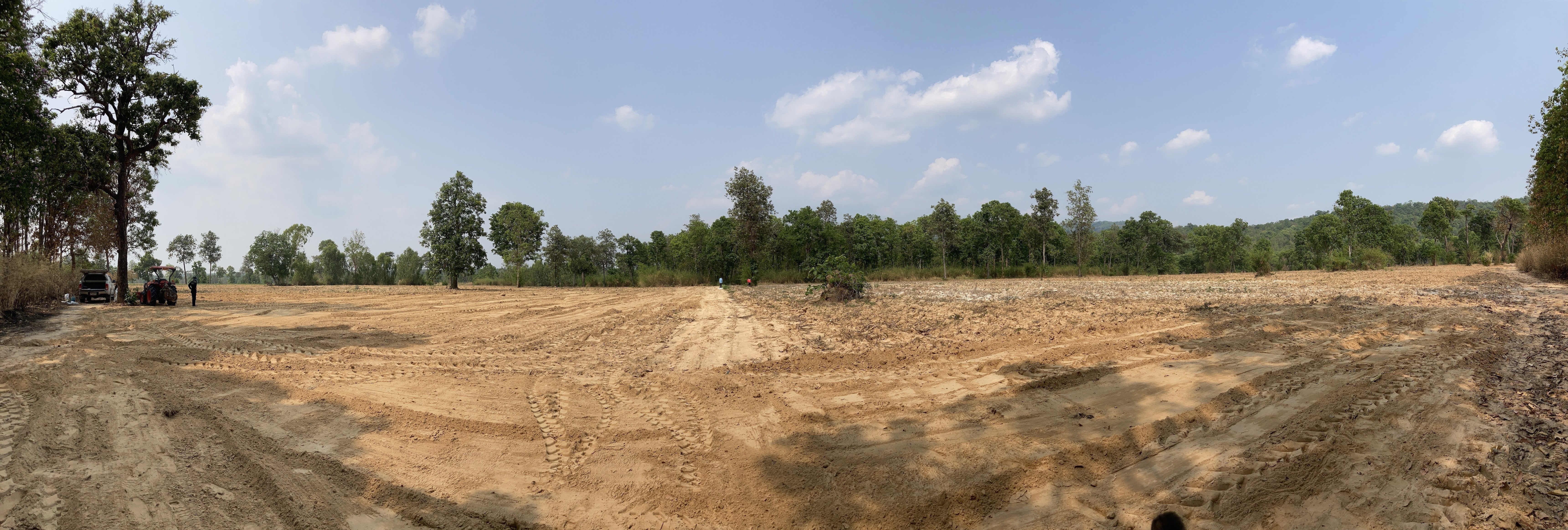 この土地がちょうど8ライ(約12,800㎡/サッカーコート約2面分)です。元々キャッサバ畑だった場所で、凹凸があり平坦でない箇所があるため、トラクターで土地を耕す作業と、苦土石灰を撒く作業に分かれて進めました。