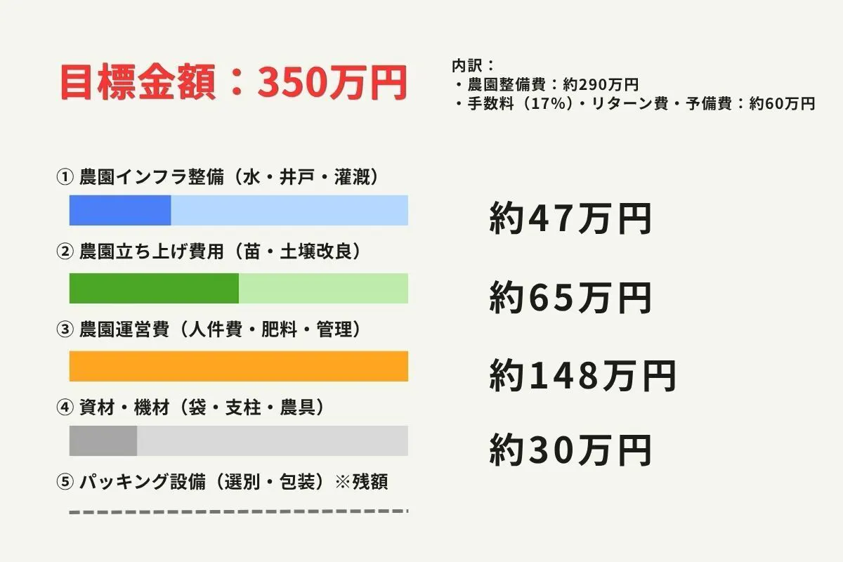 今回の目標金額は350万円です。主な使い道は以下の通りです。