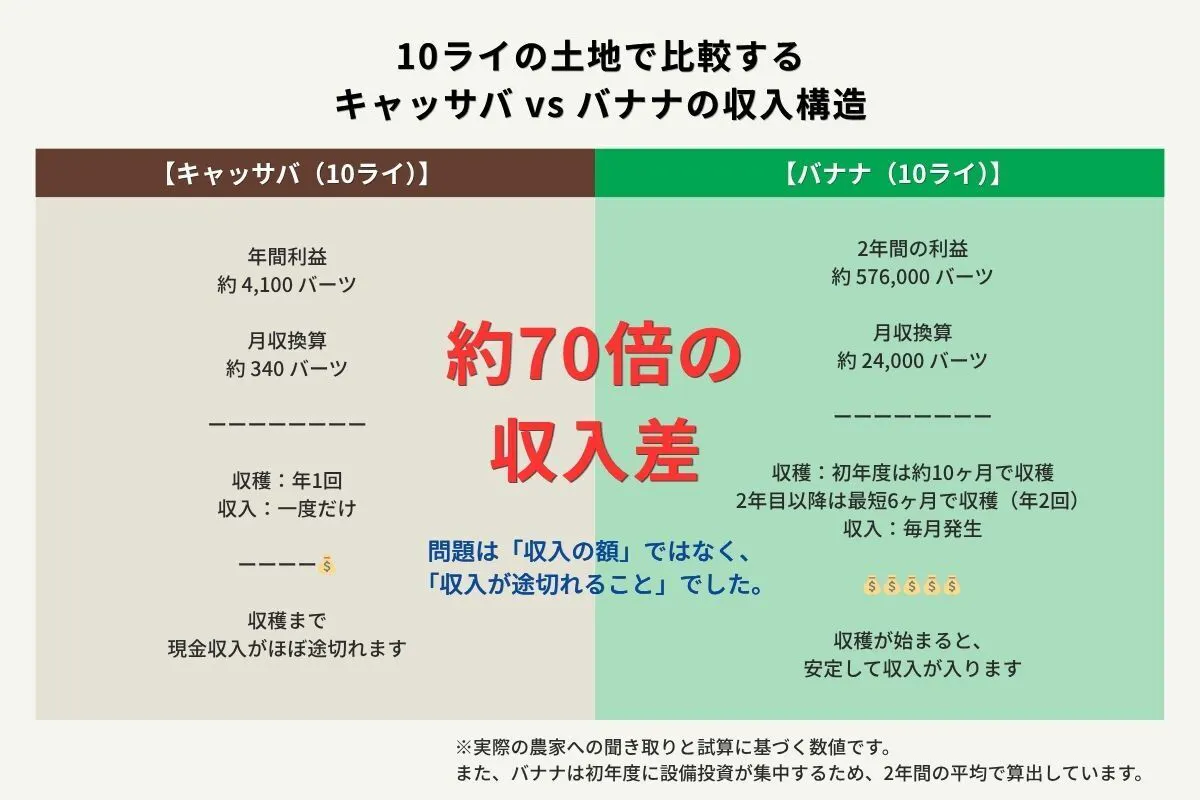 もしもバナナに切り替えたら、同じ10ライで、月収換算で約24,000バーツ(約120,000円)。