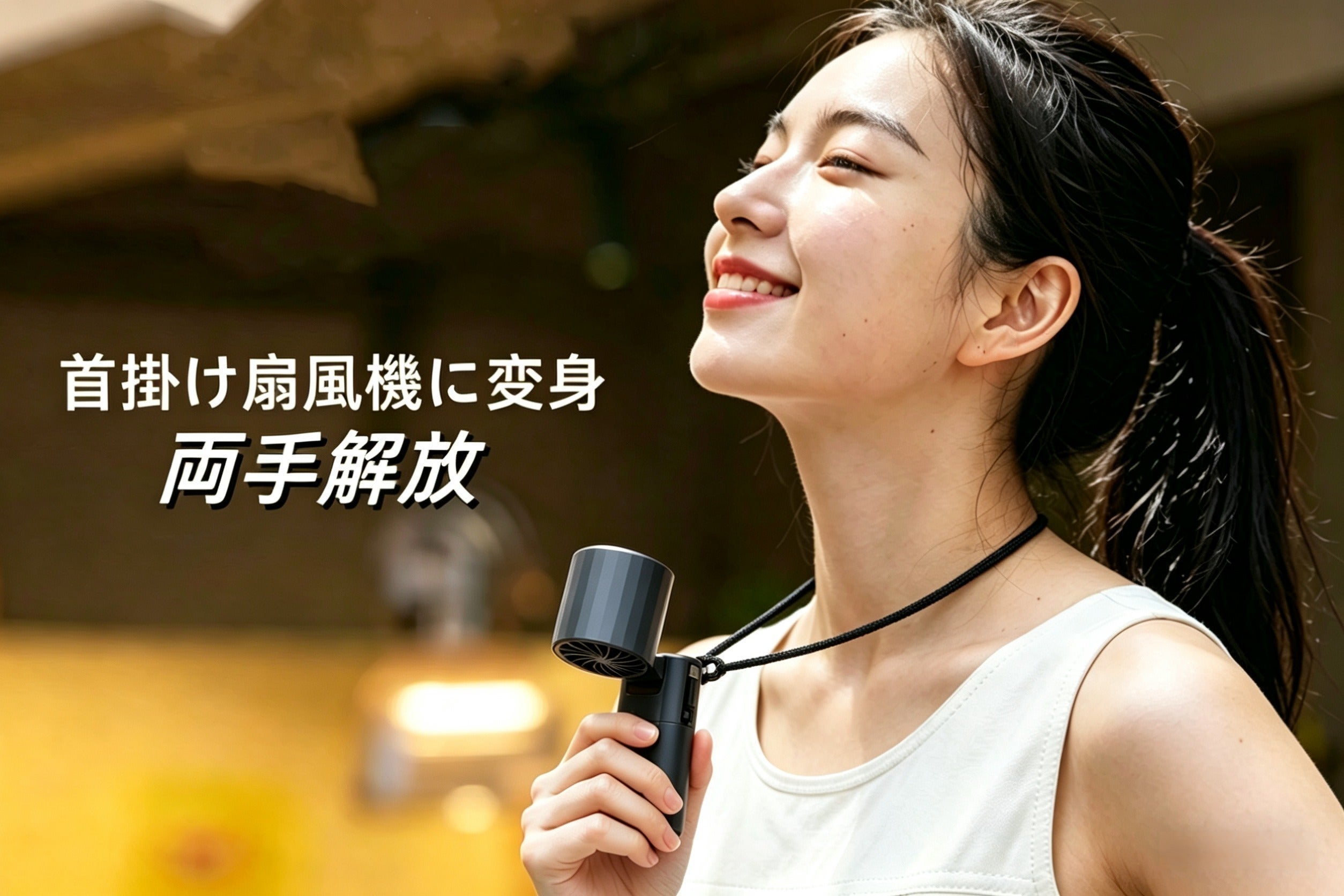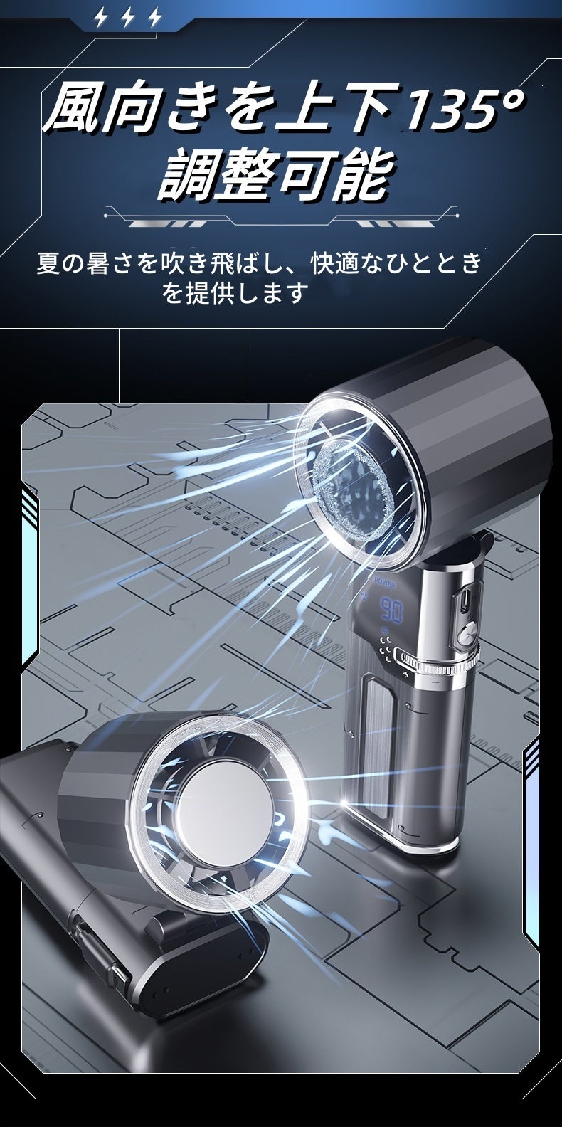 革命的な上下90度首調節可能で、手元も顔も涼しく、自分流の涼しさを追求します。