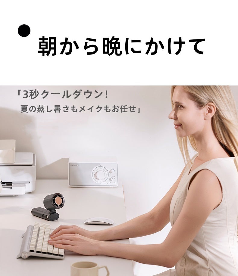 プロ級風量で汗を瞬間蒸発、オフィスや図書館用「そよ風モード」からアウトドア用「竜巻モード」まで、お好みに合わせてができます。酷暑から解放され、朝から晩まで涼しい快適さをお楽しみいただけます。