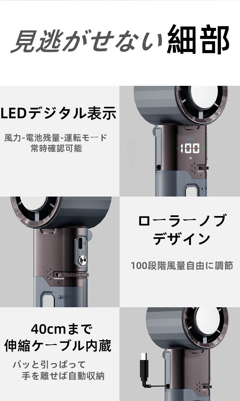 ターボ100段階調整ハイスピードハンドファン、ターボウィングブレード搭載で、