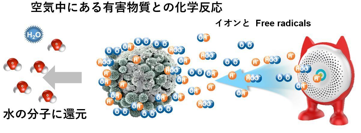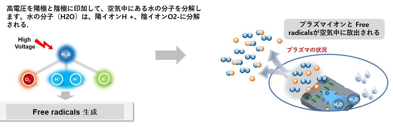 プラズマ技術は、空気中に存在する水分の粒子に高電圧をかけて、有害な細菌やウイルスに結合させて不活性化させる空気浄化技術です。