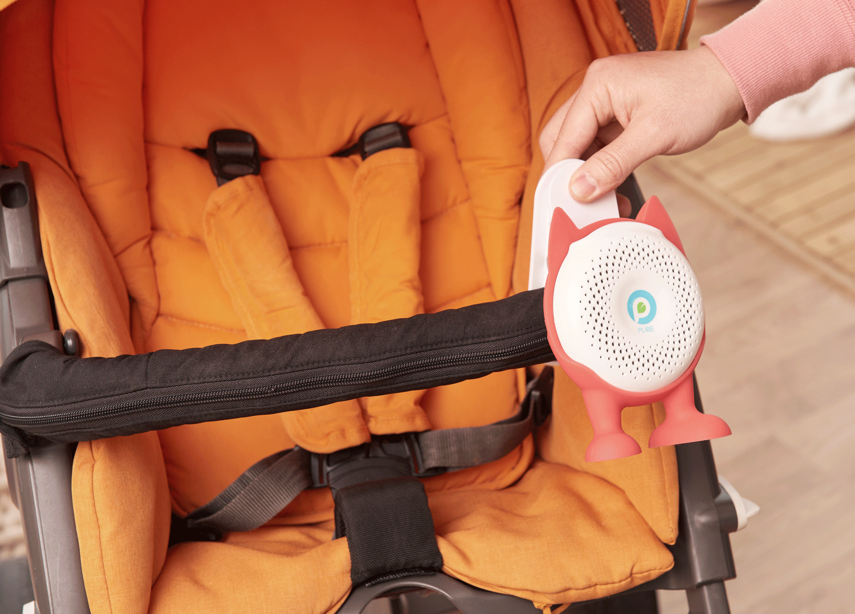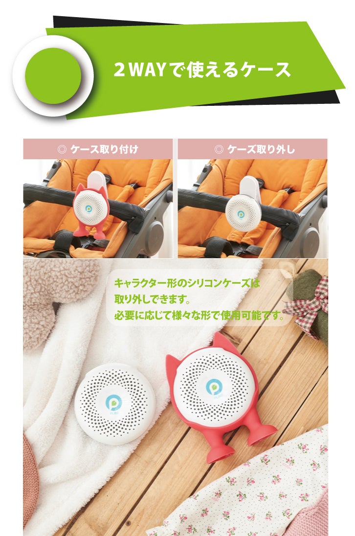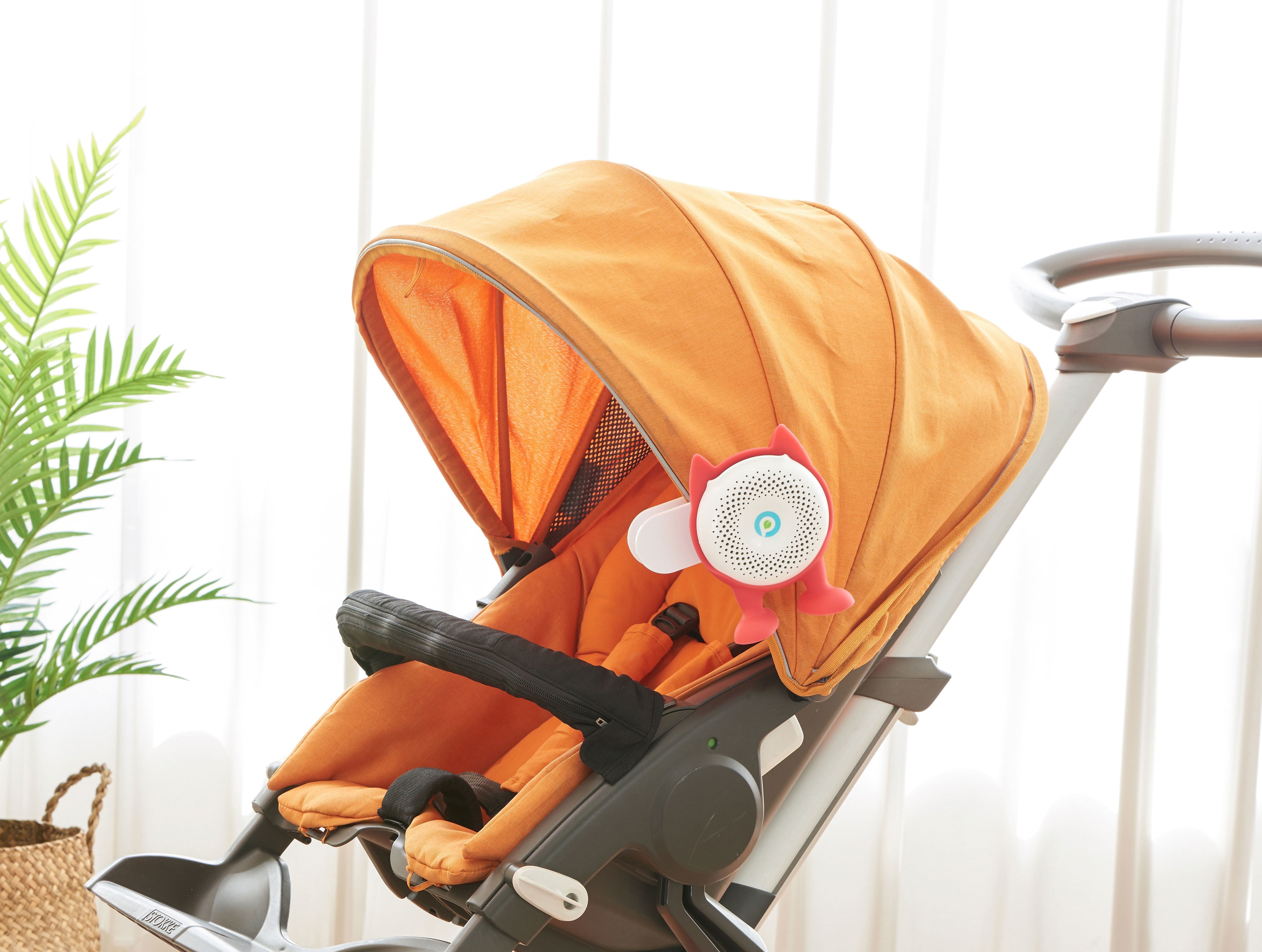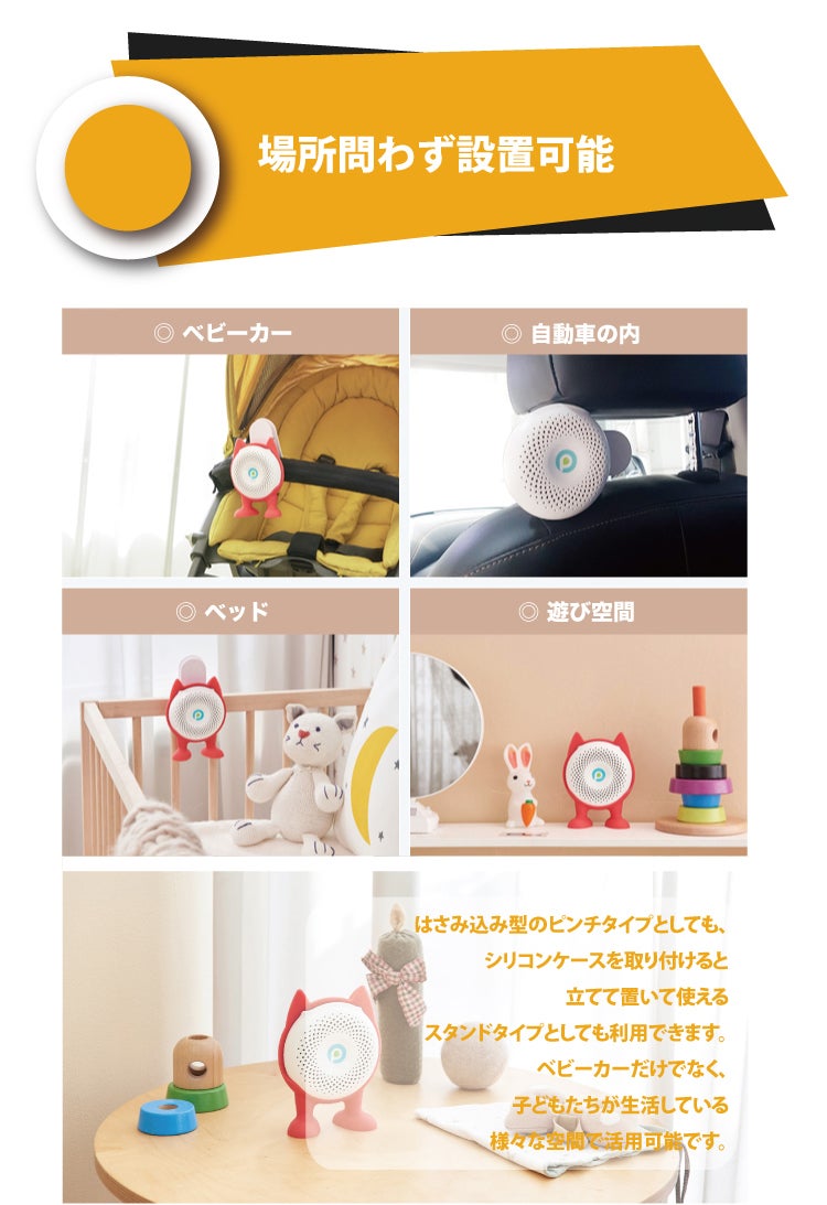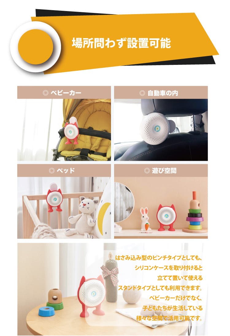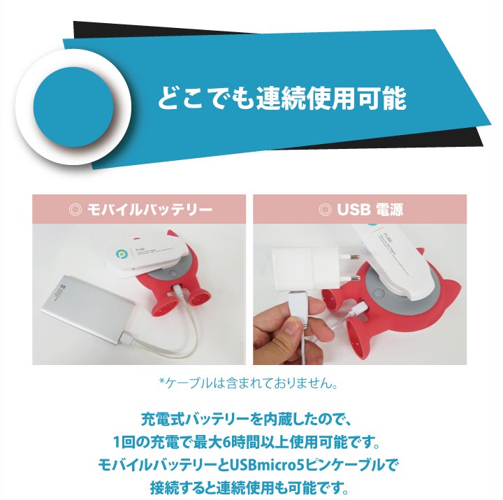 ベビーカーのハンドルや幕、自動車のヘッドレスト、赤ちゃん用ベッド、テーブルの上などあらゆる場所での使用が可能であり、1回の充電で約6時間の使用が可能です。