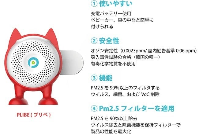 私たちは、韓国の会社であるため、常に隣接している中国から飛散するPM2.5の驚異にさらされており、愛する子供たちが安心して自由に外出ができるようにしたいと考えて製品を開発しました。いつ,どんな時でも「赤ちゃんを守ることができるようにする」というのが「プリべ」の最初の出発点です。赤ちゃん専用に留まらず、大人の方にもポータブル空気清浄機として使用可能な製品です。
