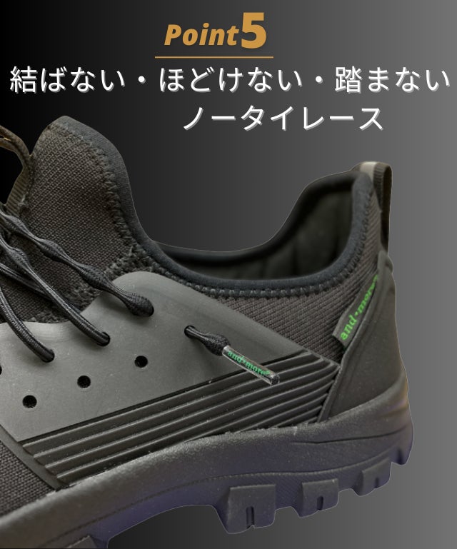 突然の雨も気にならない撥水性、濡れた道でもしっかり踏み込める高いグリップ力、そして、脱ぎ履きがスムーズなノータイレース仕様。