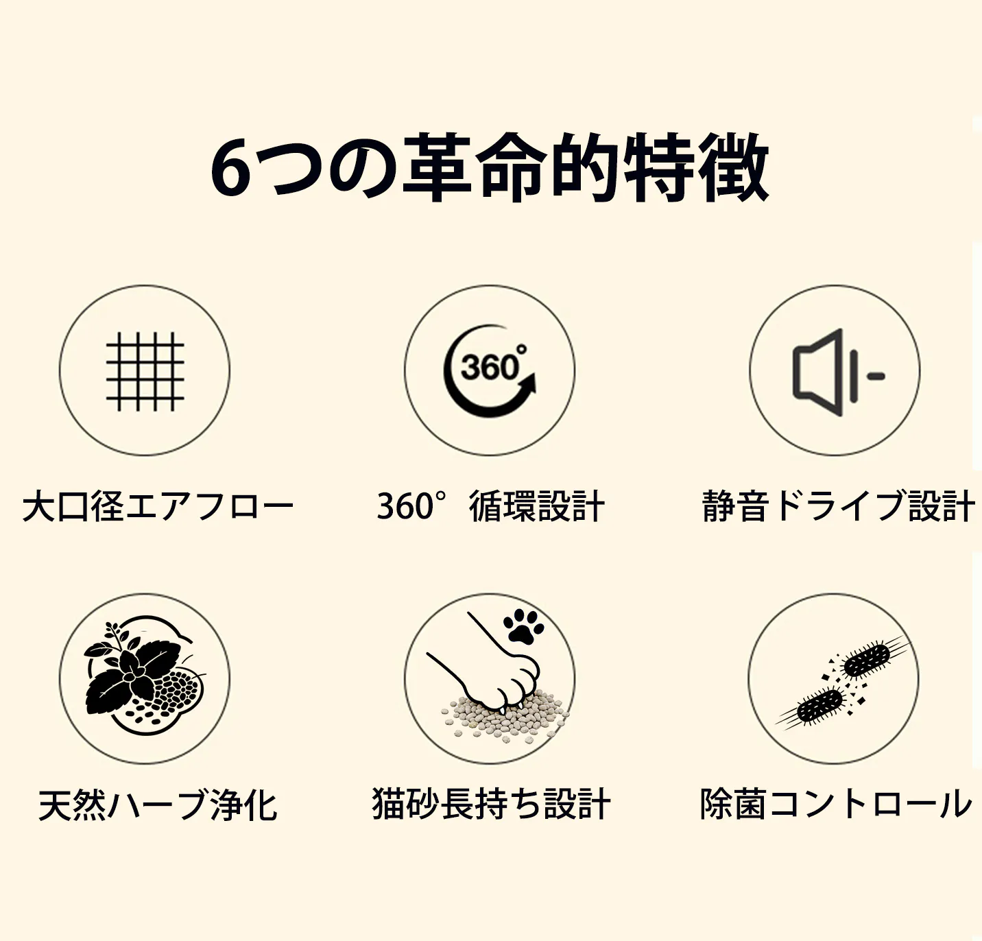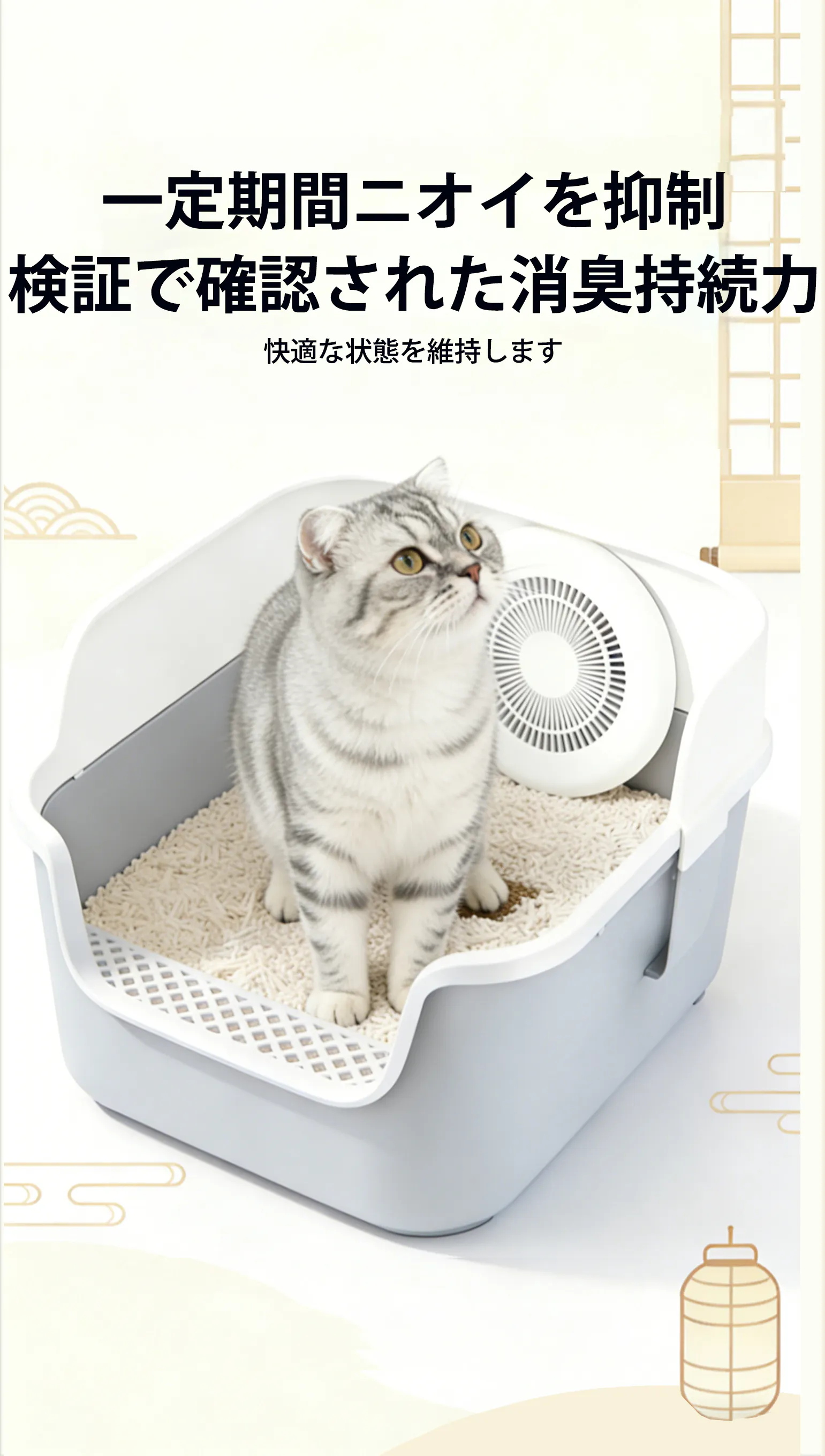 本製品は猫砂や空間にこもる臭いの元をしっかりケアしながら、掃除の頻度を減らして快適な空間を保てるため、ニオイや頻繁な猫砂交換に悩まされることはなくなります。