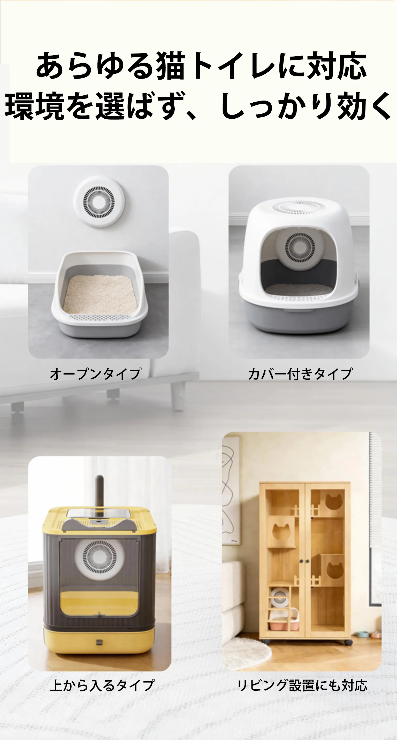 設置場所を選ばず、さまざまなタイプの猫トイレに対応します。形状に合わせて柔軟に使えるので、環境を変えずにそのまま導入できます。