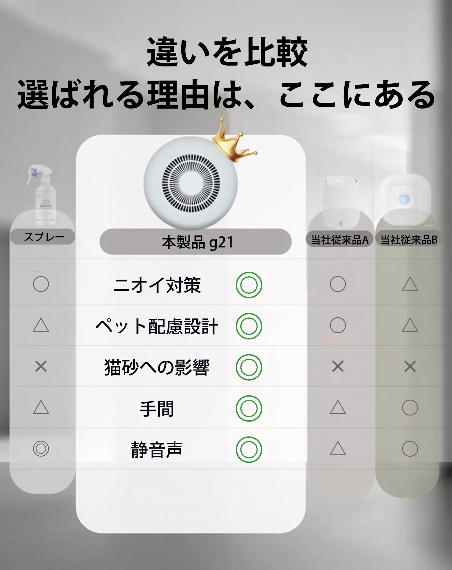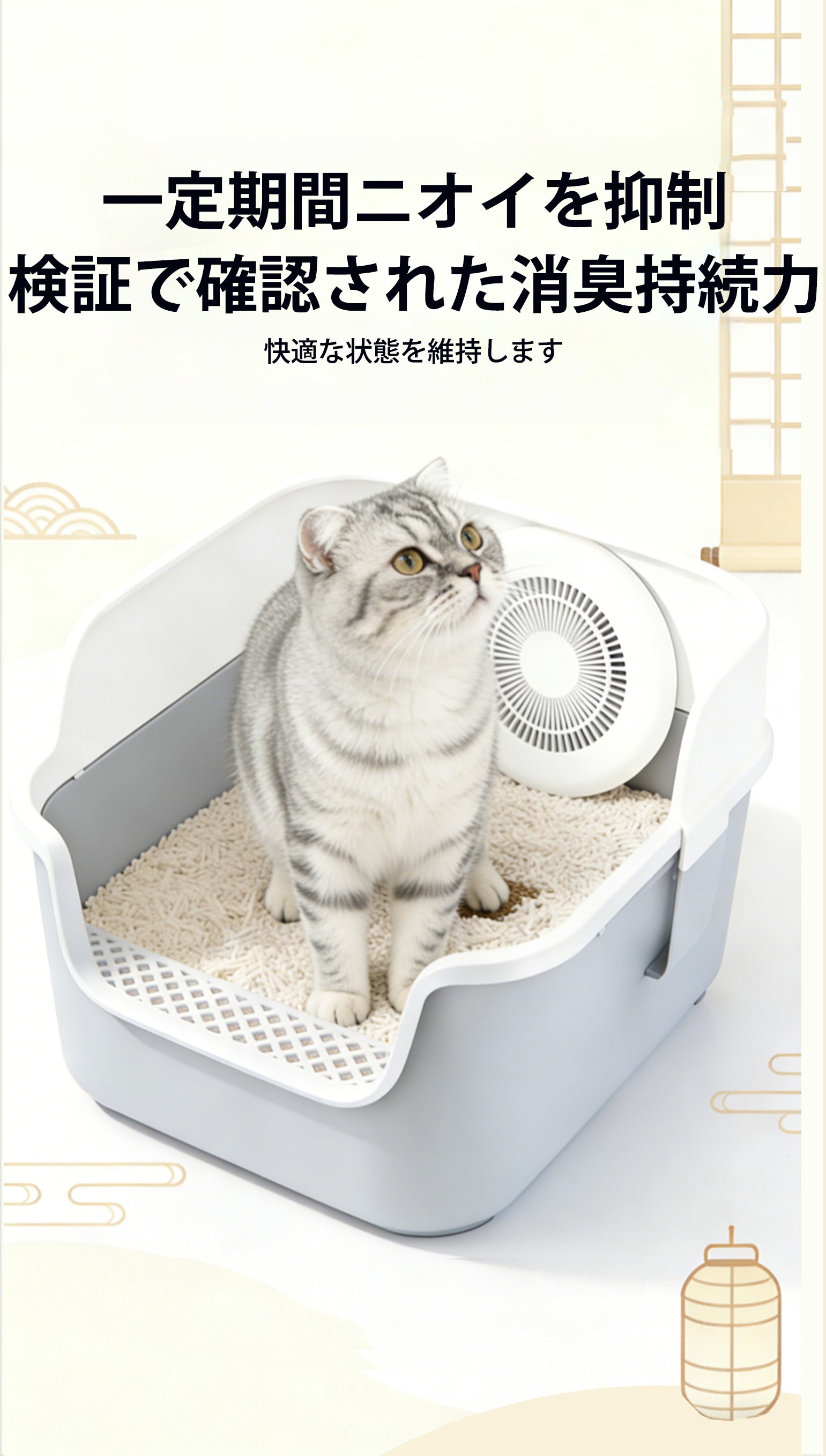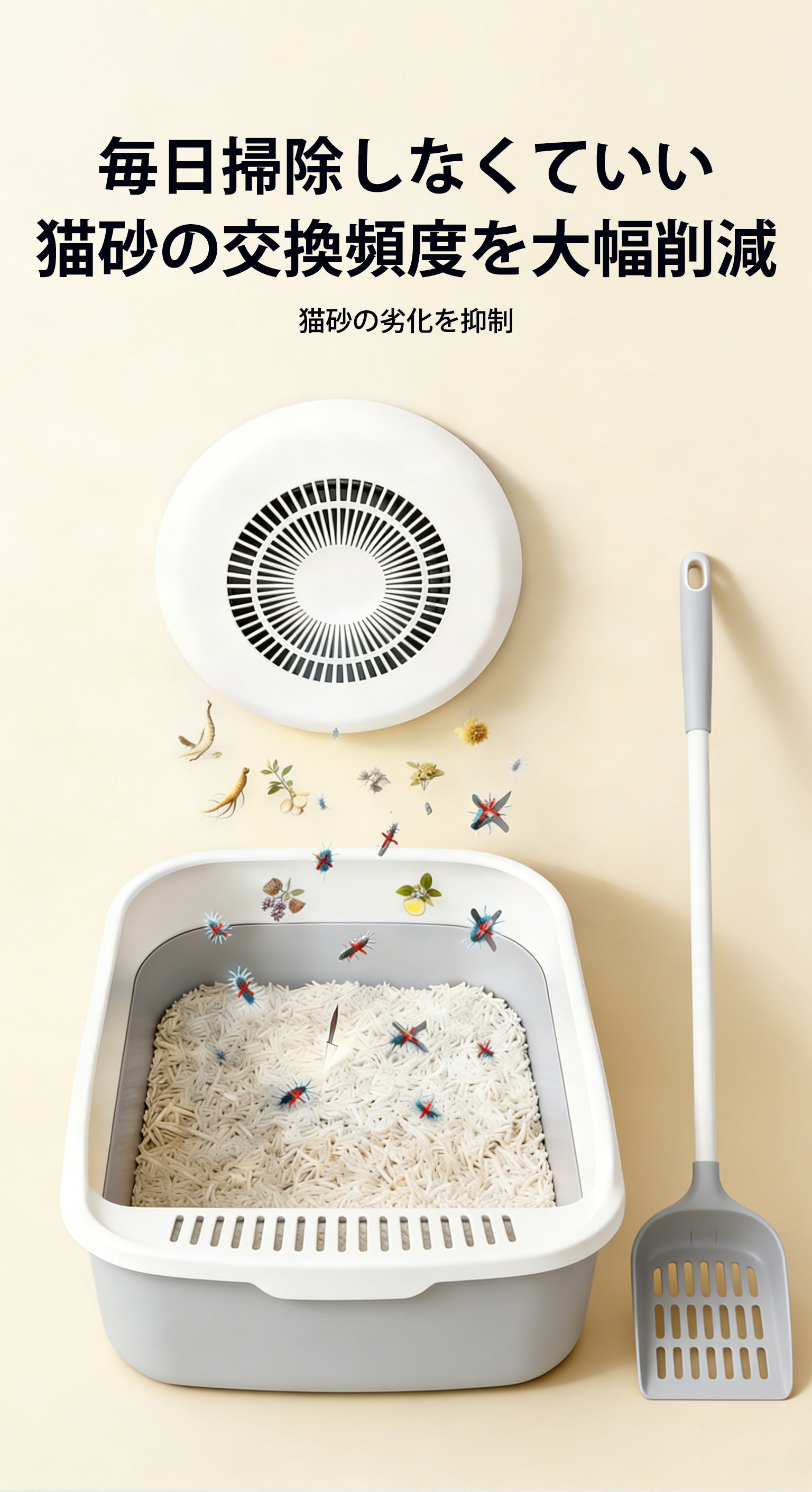 本製品は猫砂や空間にこもる臭いの元をしっかりケアしながら、掃除の頻度を減らして快適な空間を保てるため、ニオイや頻繁な猫砂交換に悩まされることはなくなります。