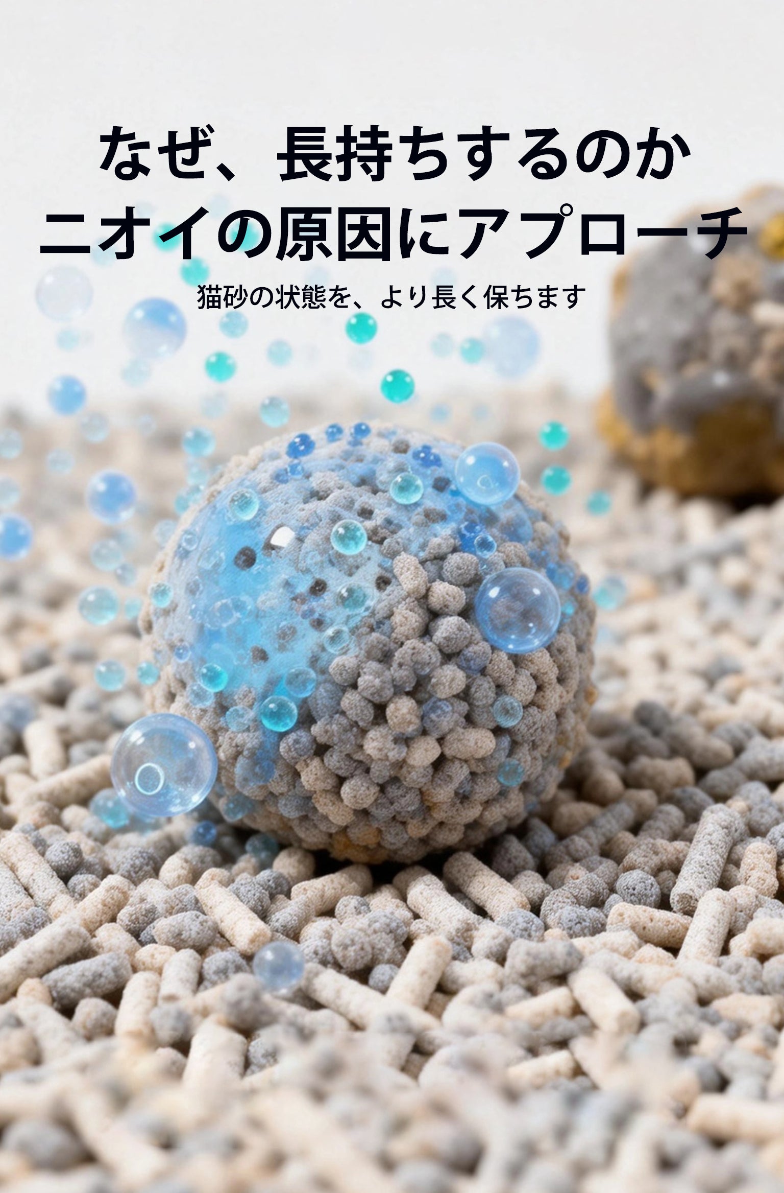 ニオイの原因となる菌やガスを抑え、猫砂の状態を清潔に保ちます。結果として交換の回数を減らせるので、ムダな消費を抑えながら長く使い続けることができます。