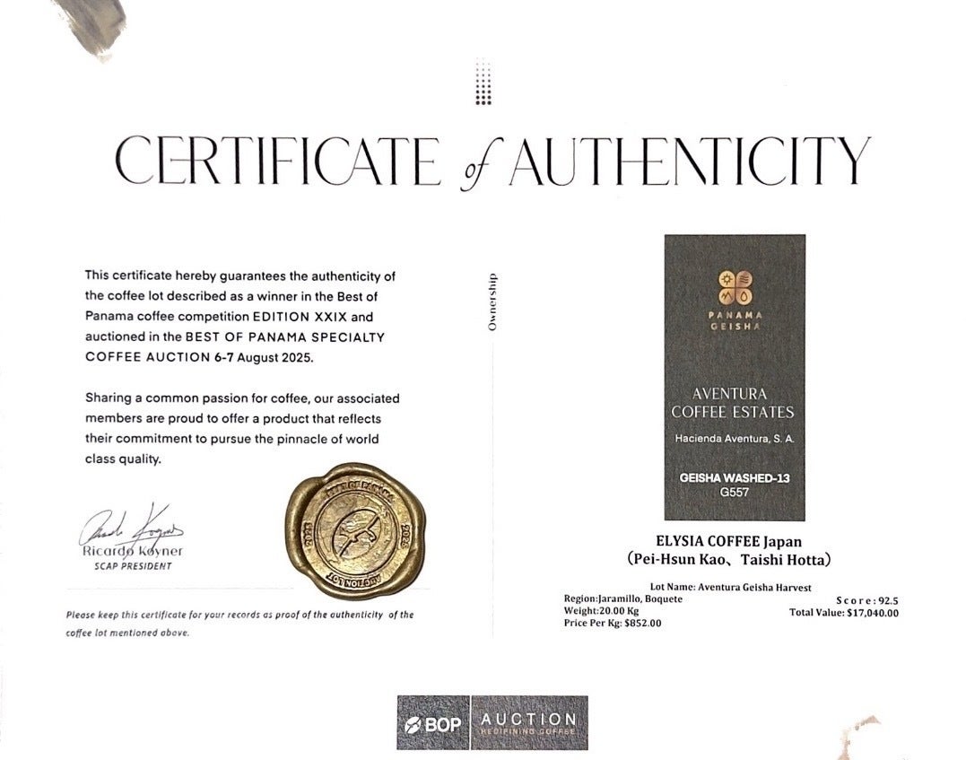 2025年8月、私はBest of Panama(パナマの国際品評会)ゲイシャ種GW-13ロットを単独落札しました。世界中のロースターやバイヤーが競り合う国際オークションで、開業前の21歳の私が一ロットを勝ち取ったのは世界的に異例なことだとよく言われます。