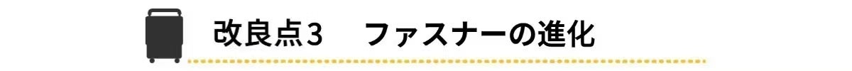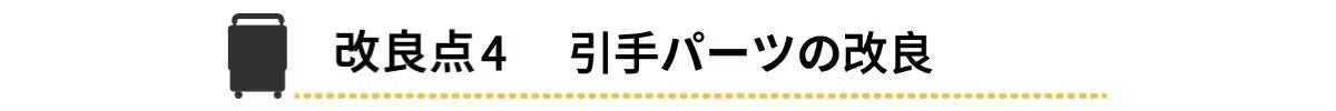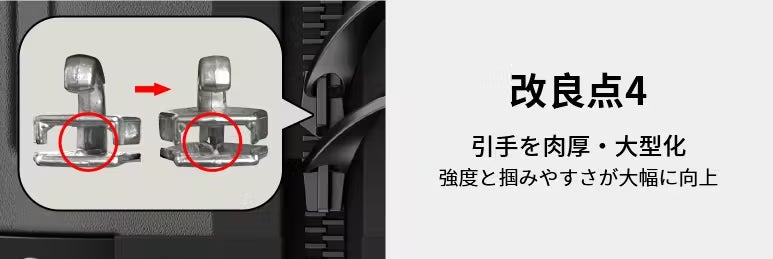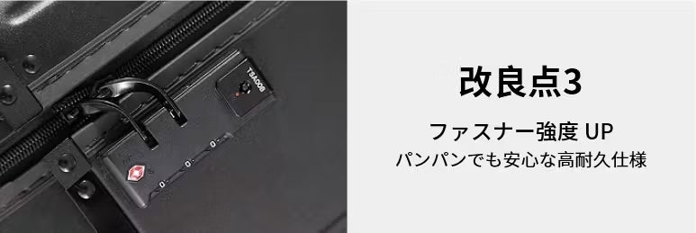 サイズ変更の要となる、スーツケース内部のロックパーツ(留め具)を新仕様に変更しました。サイズ拡張後にボディを内側からガッチリとロックすることで、可変式特有の「ズレ」や「グラつき」を防止。まるで1枚のハードケースのような、頼もしい一体感と強度を確保しています。