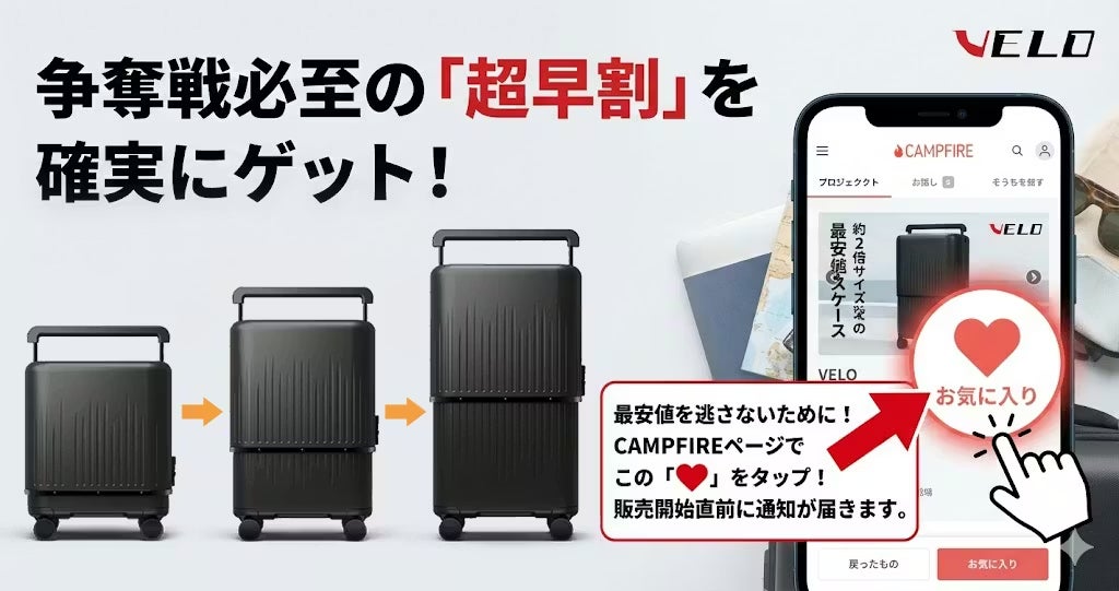 【速報:CAMPFIREにてクラウドファンディング開始!】本日4月14日(火) 10:00より、変形するスマートスーツケース**「VELO」第3世代**の先行販売をCAMPFIREにて開始いたしました。■ シルバーモデル限定:100個限定で「翌日発送」対応!通常、クラウドファンディングではお届けまでにお時間をいただきますが、今回は特別にご用意しました。「シルバー(Silver)」モデルに限り、ご支援いただいた翌日に発送いたします!■ 限定数: 先着100個特典: 待たずにすぐ、次世代の旅行体験をスタートできます。※無くなり次第終了となりますので、お急ぎください!■ ビックカメラ池袋西口 IT TOWER店で実機をチェック!本日より、**ビックカメラ池袋西口 IT TOWER店(Bic FIRE)**にて実機の展示もスタートしました。 「翌日発送のシルバーの質感を確認したい」「サイズの変化を試したい」という方は、ぜひ店頭へお越しください!■ 多くのメディアが注目フジテレビ「めざましテレビ」をはじめ、多くのメディアで紹介された「サイズが変わる」魔法のスーツケース。今回のCAMPFIREプロジェクトが、お得に手に入る最後のチャンスかもしれません。▼今すぐシルバーモデルを確保するhttps://camp-fire.jp/projects/939882/view▼展示情報場所:ビックカメラ池袋西口 IT TOWER店 3F(Bic FIREコーナー)「明日発送、次の旅へ。」皆様の熱いご支援をお待ちしております! もっと見る