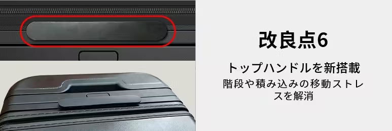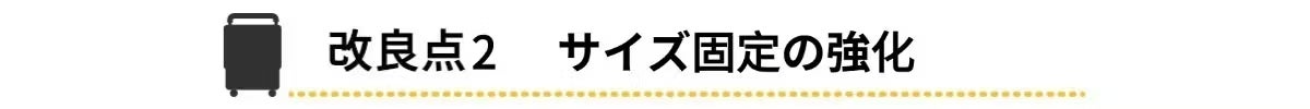 サイズ変更の要となる、スーツケース内部のロックパーツ(留め具)を新仕様に変更しました。サイズ拡張後にボディを内側からガッチリとロックすることで、可変式特有の「ズレ」や「グラつき」を防止。まるで1枚のハードケースのような、頼もしい一体感と強度を確保しています。