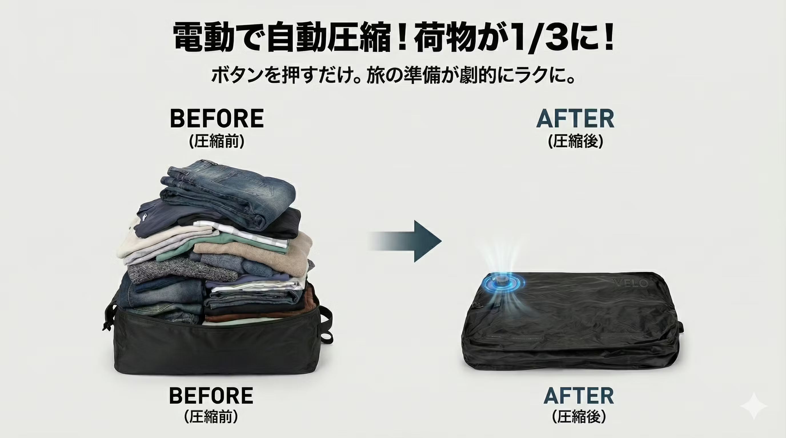 かさばる衣類を驚くほどコンパクトに。 バッグに衣類を入れ、ボタンを一つ押すだけで自動で空気を吸引。あっという間に厚みが減り、VELOの収納スペースを最大限に活用できます。掃除機いらずで、旅先でのパッキングもこれ一つでスマートに完結します。さらに、日本の電気用品安全法(PSE)の基準に適合しておりますので、安心して長くご愛用いただけます。