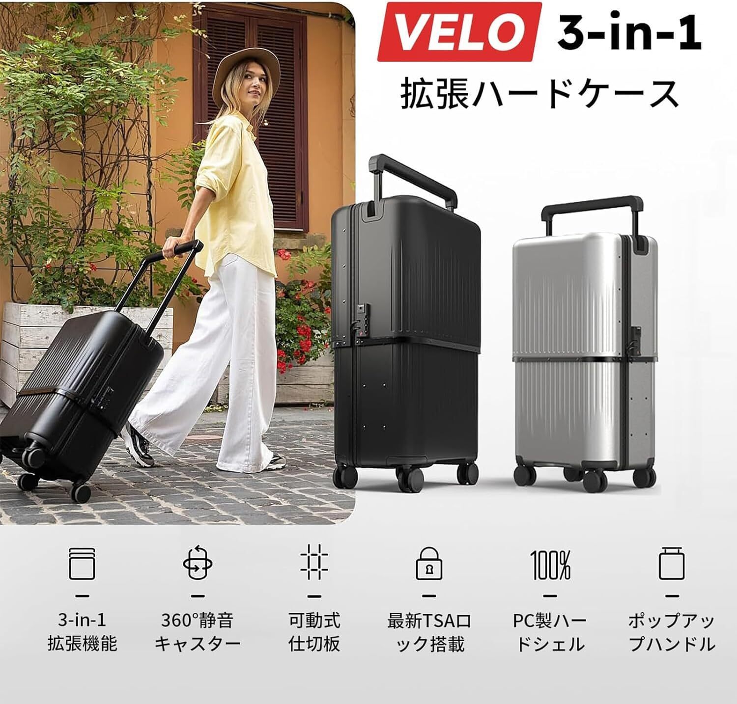 家に1台、VELOがあればいい。どんな旅にもフィットする変幻自在のボディが、あなたの移動を劇的に自由にします。 弾丸旅行も、ロングステイも。どこに行く時も、常に最適なサイズであなたに寄り添う、唯一無二のスーツケースです。