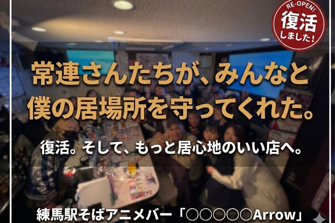 2021年1月22日にオープンした「練馬エンターテイメントアニメバー○○○○Arrow(まるまるまるまるあろー)」。(その際にクラファンご協力いただいた皆さん、ありがとうございます!)