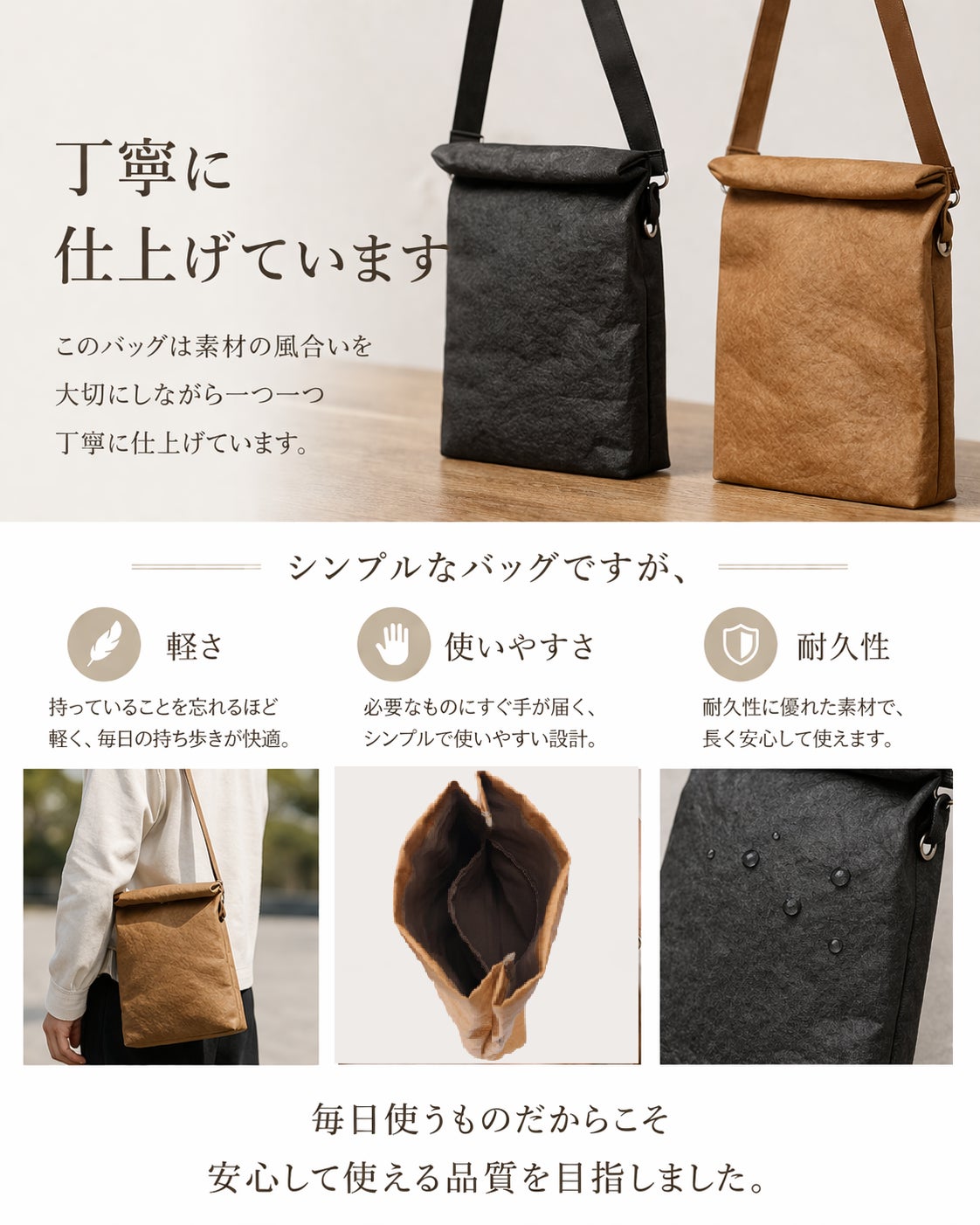 軽さと耐久性、機能性を兼ね備えた素材で日常使いしやすいバッグを作りました。
