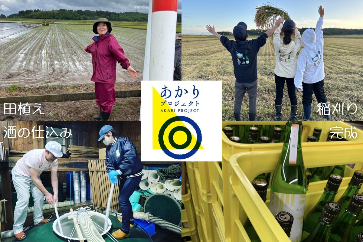 普段は、秋田の日本酒を販売している酒屋ですが、まゆみさん自身で日本酒も醸造しています。日本酒のおいしさ、素晴らしさをもっと多くの人たちに知っていただきたいという思いから、2022年、まゆみさんを中心に「あかりプロジェクト」をスタートさせました。春の田植えから始まり、秋には稲刈り、冬にはお酒を仕込み、そして翌春に完成する「純米吟醸 あかり」の販売にいたるまで、まゆみさん自身も行っています。名前の「あかり」には、「心に希望の明かりがともるように」との願いがこめられています。