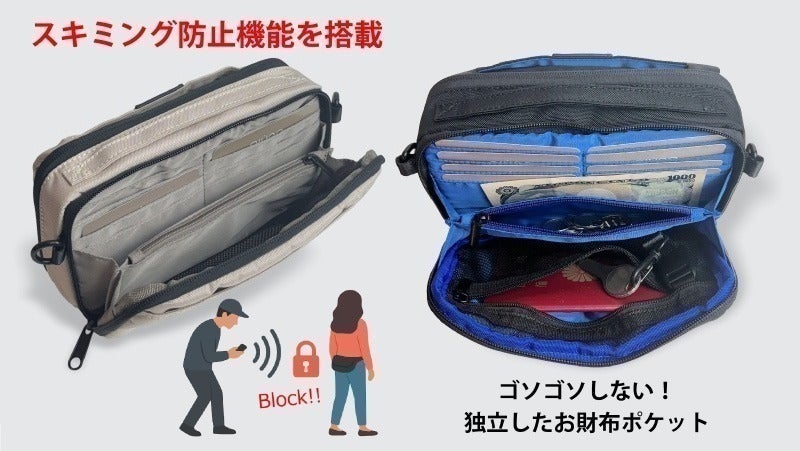 お財布スペースは、RFIDブロッキング素材を採用し、クレジットカードやICカードの不正読み取りを防止するスキミング防止機能を搭載したので、海外旅行のお共としてもご活用ください。