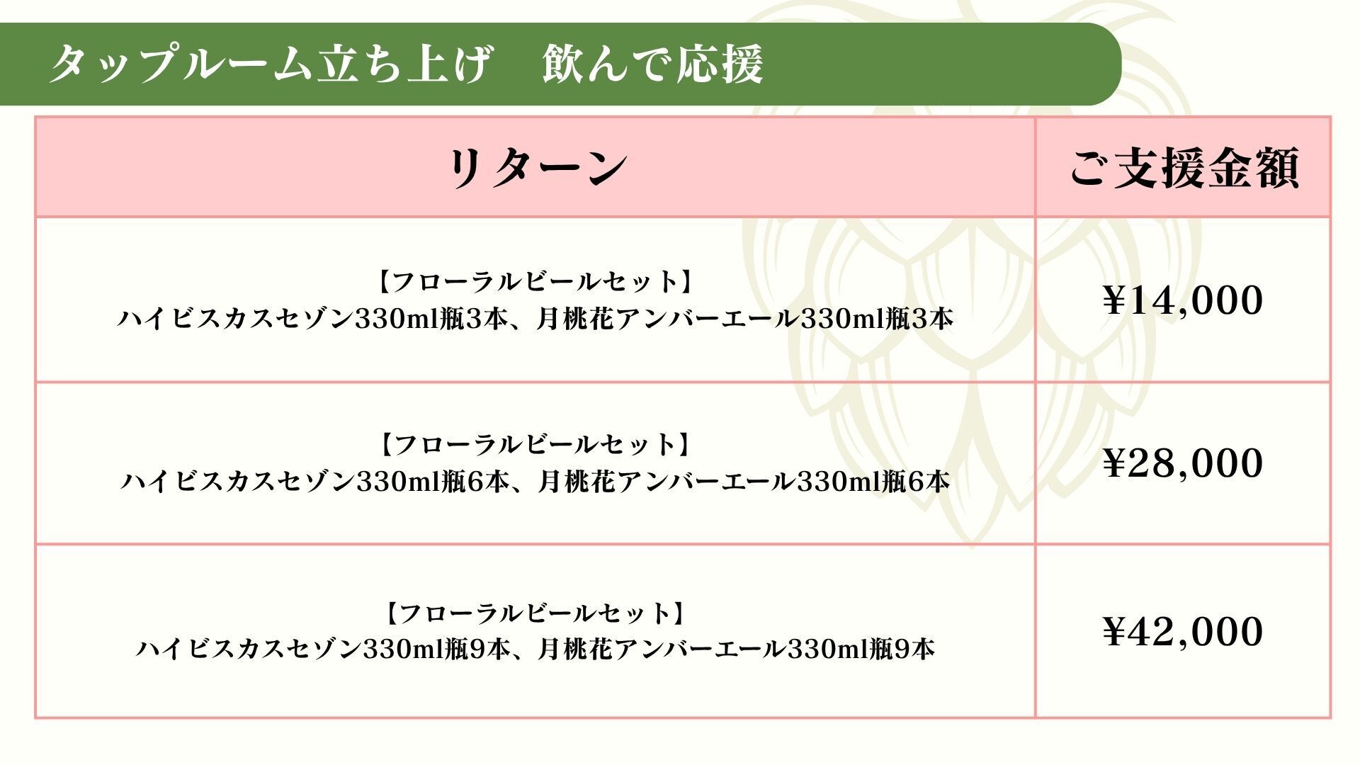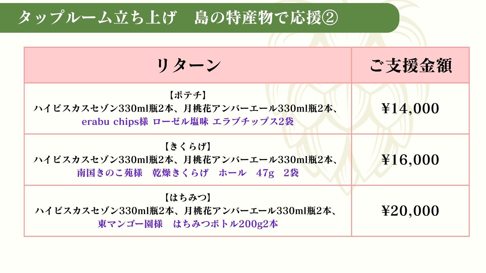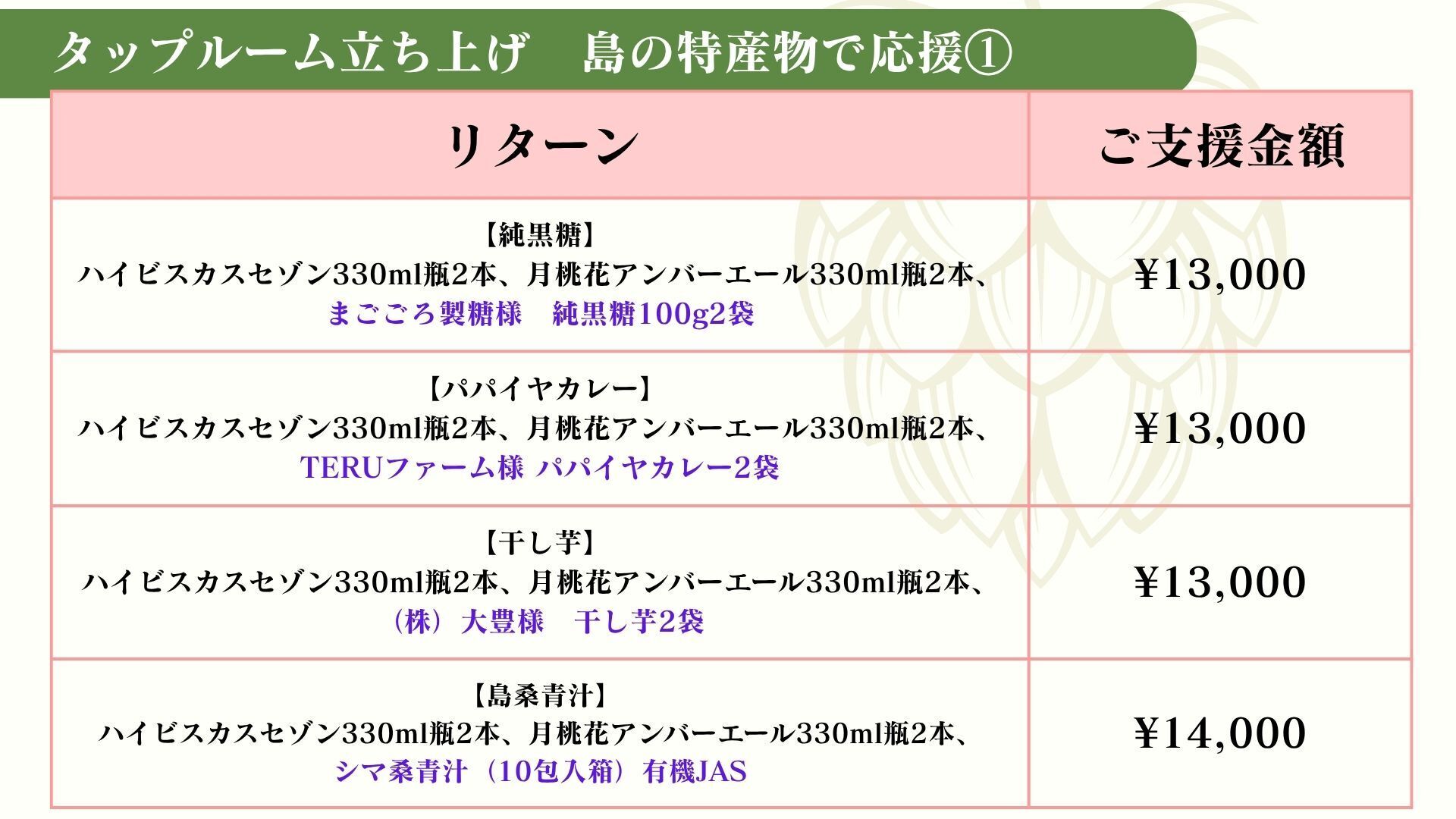 沖永良部島の産業を応援するため、幅広いジャンルのリターンをご用意しました。もちろん、私達が醸造するフローラルビールの瓶製品や試飲体験もご用意させていただきました。