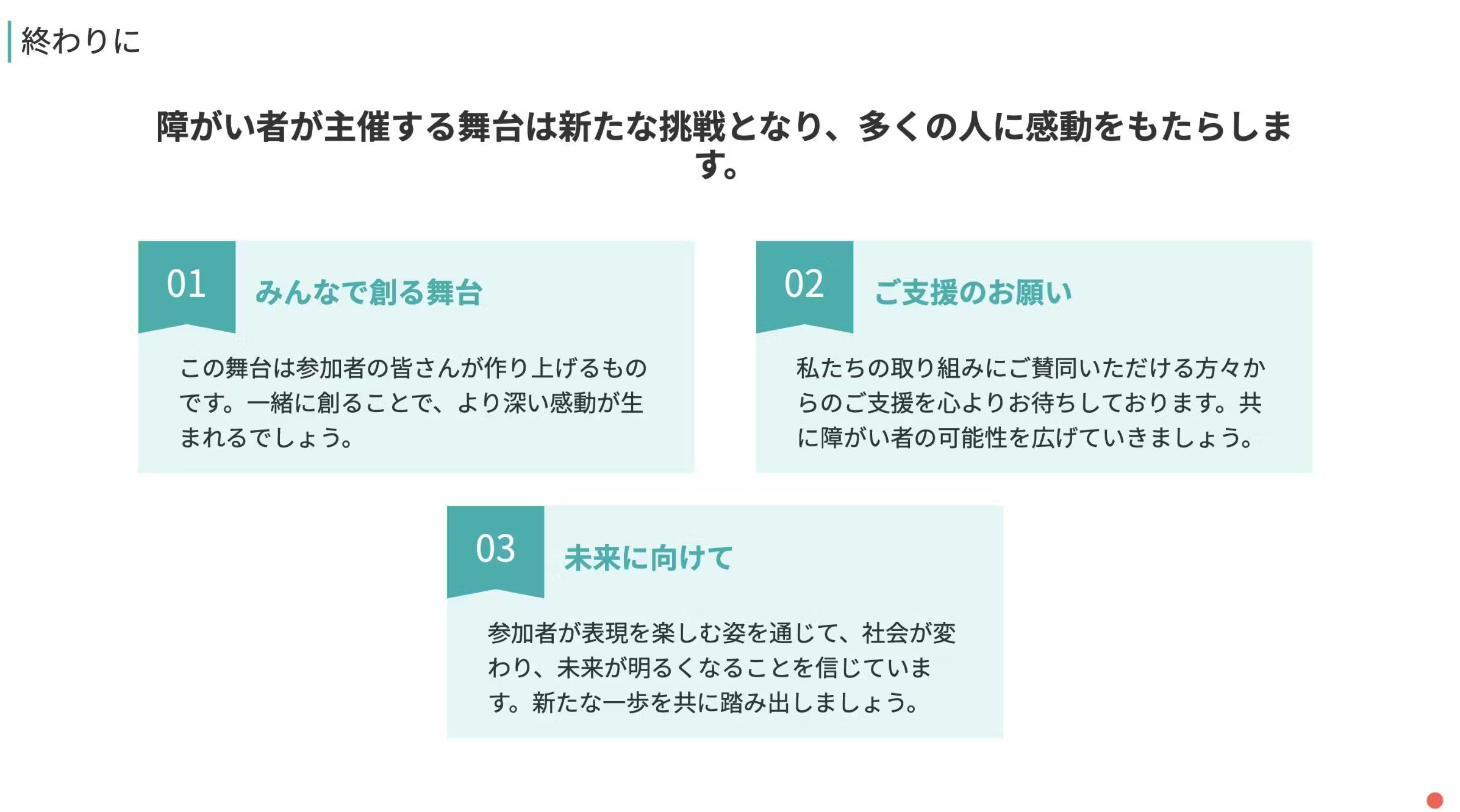 何より伝えたいのは、【障がいがあっても舞台は作れる】ということです。同じような境遇にある方々に、『諦めなくても大丈夫』というメッセージを届けたいんです。そして支援者の皆様にも、私たちと一緒に夢を叶える仲間になっていただきたいと思っています。