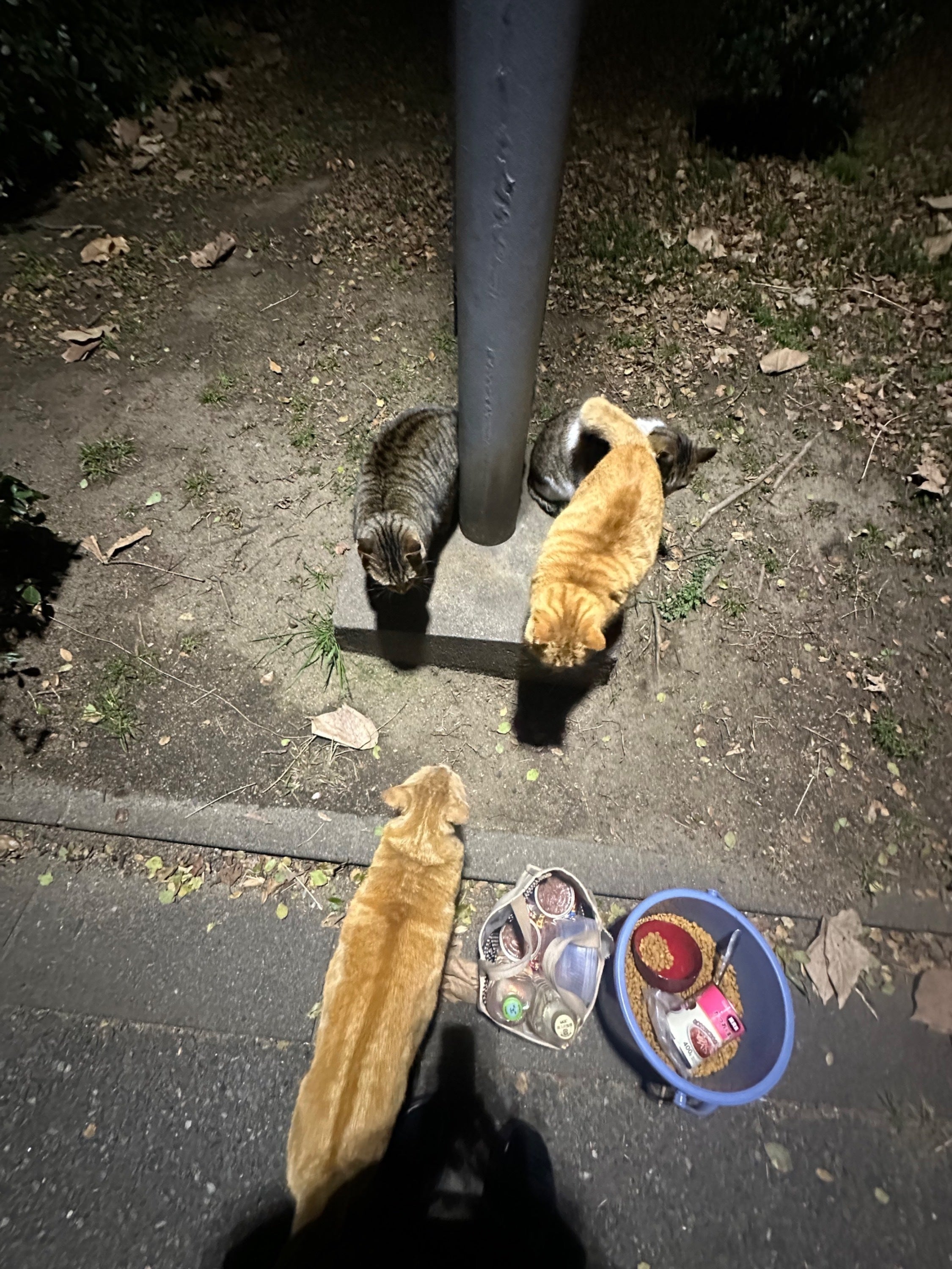 約3ヶ月〜4ヶ月の公園の野良猫たち、保護している猫たちの余裕ある食事