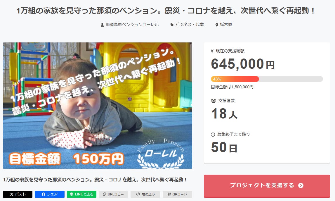 「20年で1万組の家族を迎えた宿。物価高と資金難の波で消えかかっている灯を守り、子育て世代が安価に笑い合える『実家』のような場所を未来へ繋ぎたい。」