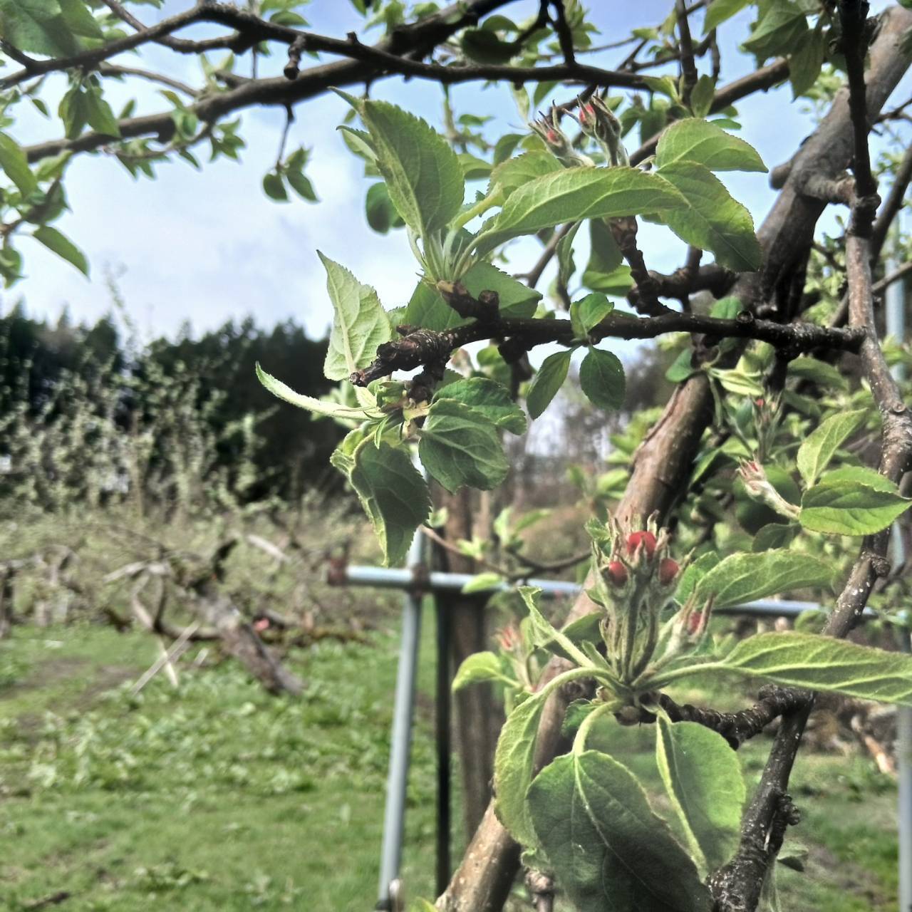 ※上記の写真は散り始めた弘前の桜です。本文の写真は、りんごのつぼみです。今月末には開花する予想です。