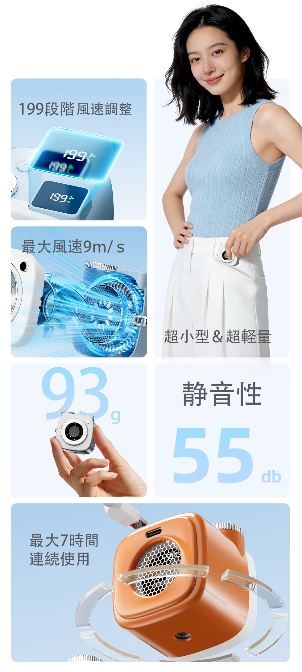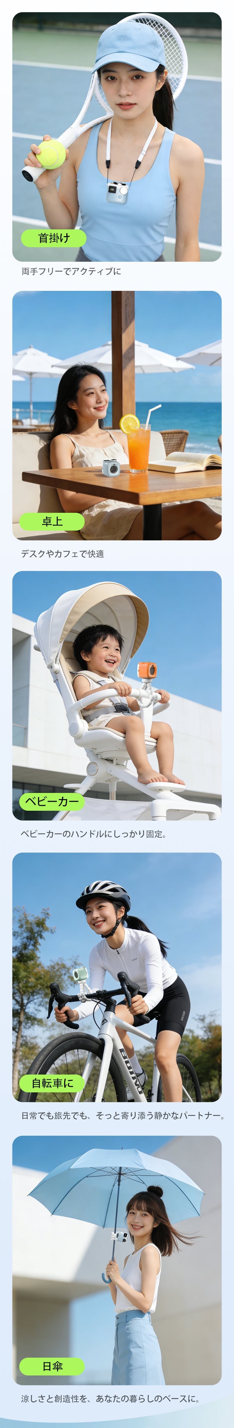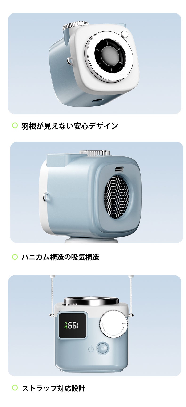 ①タコ足スタンド付きで、ベビーカー・自転車・バッグなどに簡単に取り付け可能。②まるでカメラのようなキュートなデザイン。手のひらにすっぽり収まるコンパクトサイズ。最大9m/sのパワフル送風で、猛暑の屋外でも瞬時にクールダウン。③199段階の風量調整で、シーンに合わせて細やかにコントロールできます。