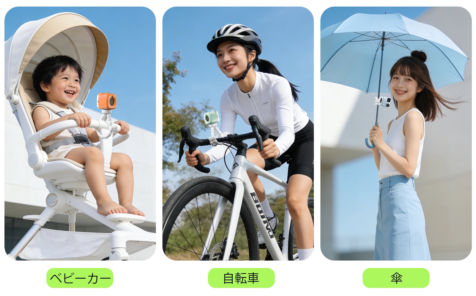 ベビーカーや傘、デスク周りなど、さまざまな場所に固定できるため、シーンに合わせて自由に使えます。
