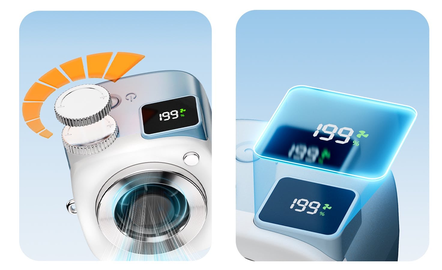 本体にはLEDディスプレイを搭載し、バッテリー残量や風量レベルをひと目で確認可能
