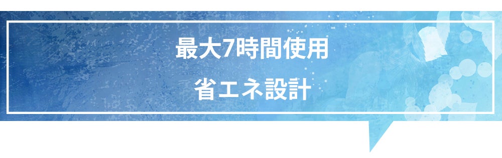 ※ 使用時間は、風速設定や使用状況によって約2時間~最大7時間になります。最大7時間は、風速1段階(5m/s)設定の連続使用時の測定値です。