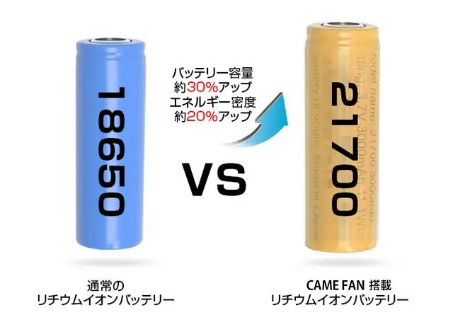 「CAME FAN」は、内蔵バッテリーに21700充電池を採用しています。一般的なポータブルデバイスに使われている18650電池より、エネルギー密度が約20%アップされ、連続利用時間が長くなります。出力も大きく、サイクル寿命も長いのが特長です。