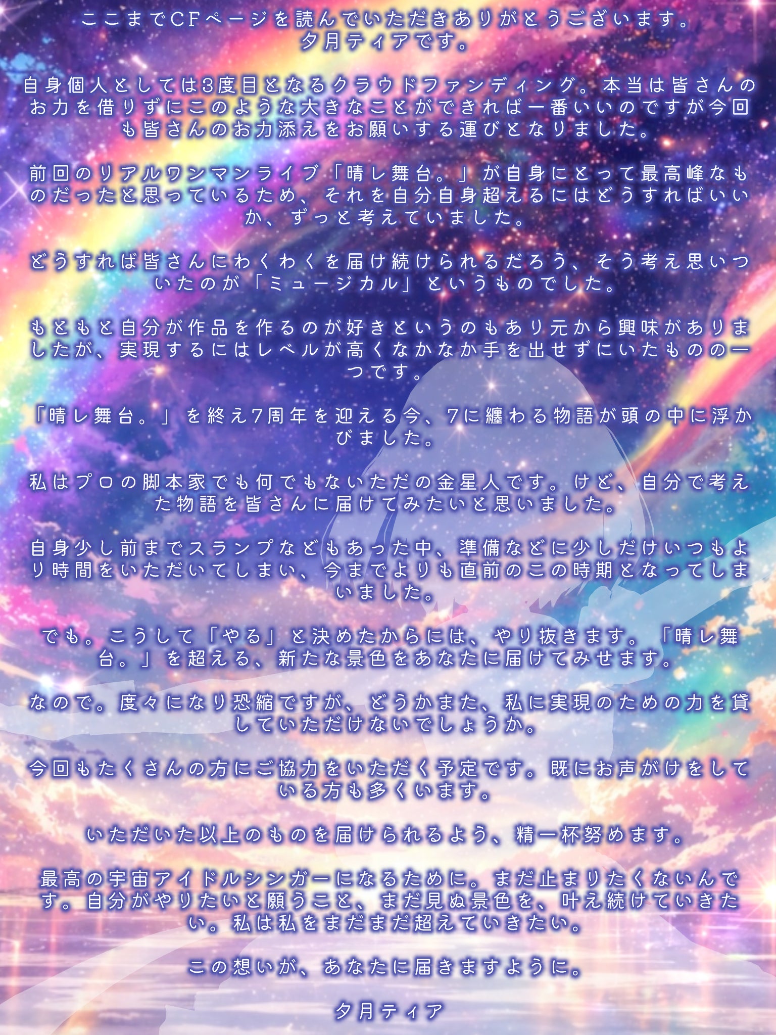 これまで積み上げてきた歌・声・物語のすべてをつぎ込んだ、私、「夕月ティア」にしかできないステージを創り上げる時が来ました。