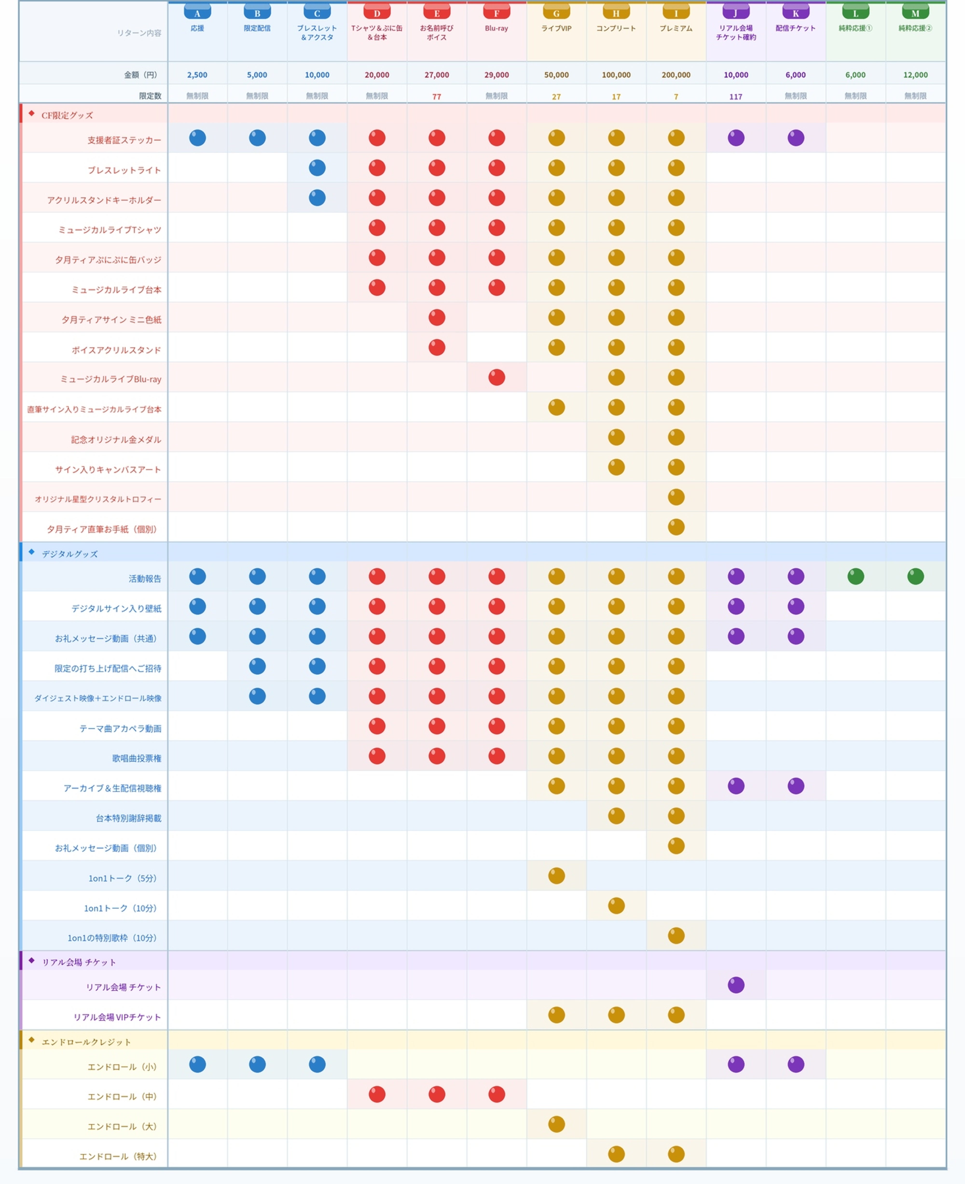 今回のリターンは、「気軽に応援したい方」「限定コンテンツを楽しみたい方」「グッズもしっかり欲しい方」「ライブを特別な形で体験したい方」それぞれに合わせてご用意しました。