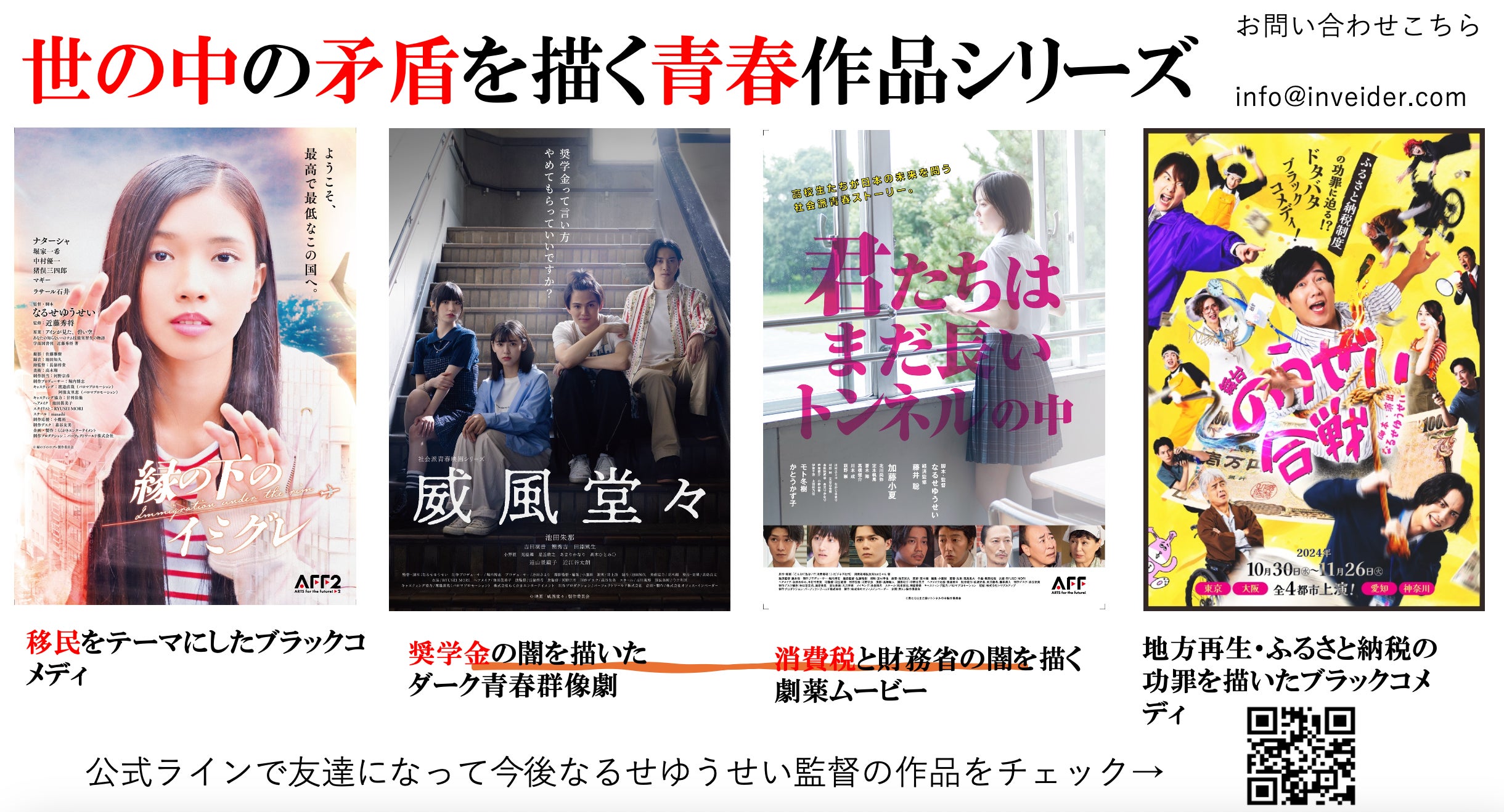 が、コロナ禍で不要不急の外出禁止とされ、エンタメの経済活動をストップせざるを得なくなって以降、世の中の違和感が膨らみ、そこからエンタメで逆襲をしなければという衝動が沸き起こりました。それで消費税の闇を描いた青春映画『君たちはまだ長いトンネルの中』を皮切りに『縁の下のイミグレ(テーマ・移民問題)』『威風堂々(テーマ・奨学金)』「のうぜい合戦(ふるさと納税の闇)」「WHO?(テーマ・お注射」など、社会課題をテーマにした作品に尽力を注ぎ、業界内では頭がおかしくなったと言われつつ、その逆に応援してくださるコミュニティも出来つつある人物でございます