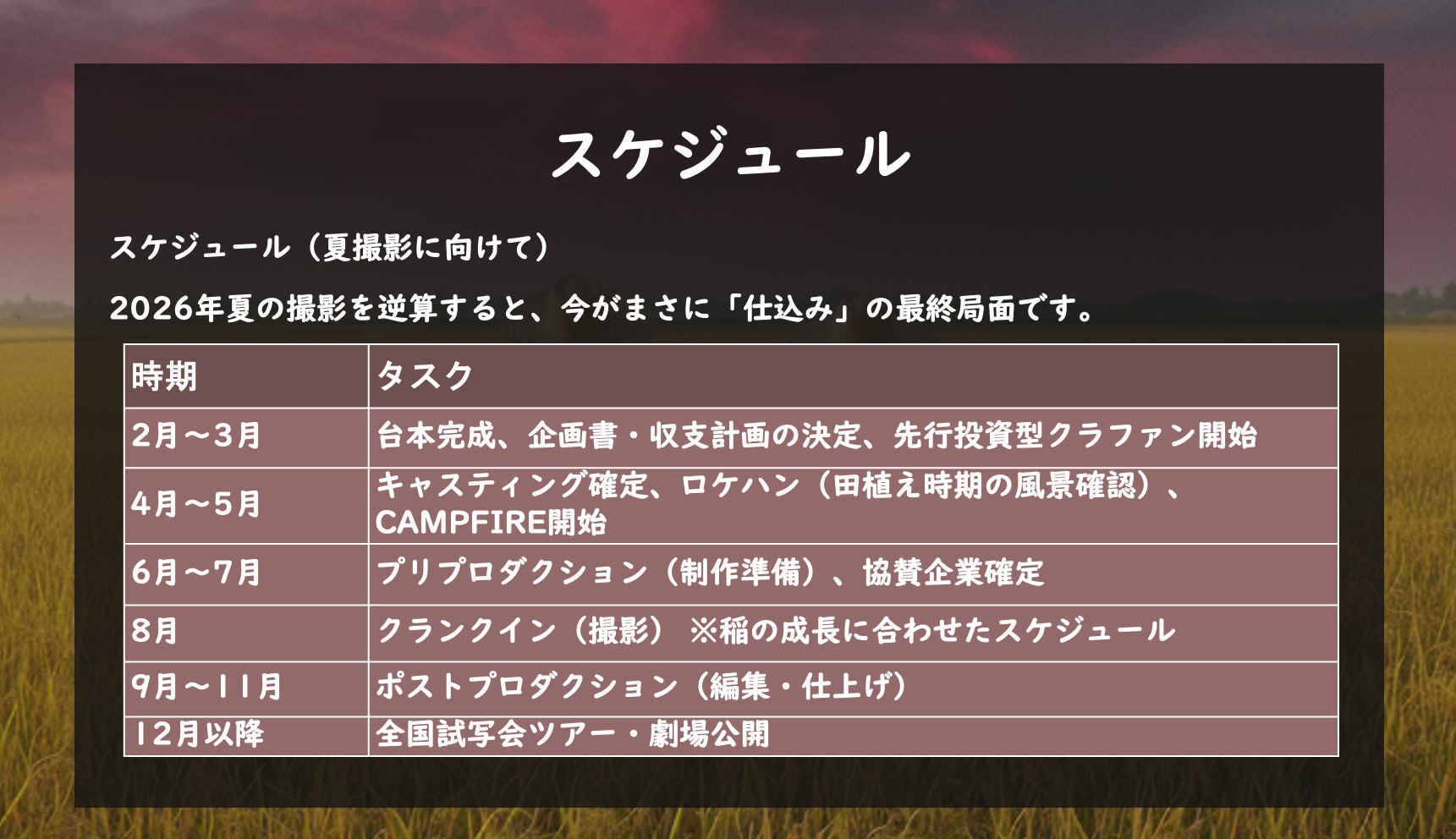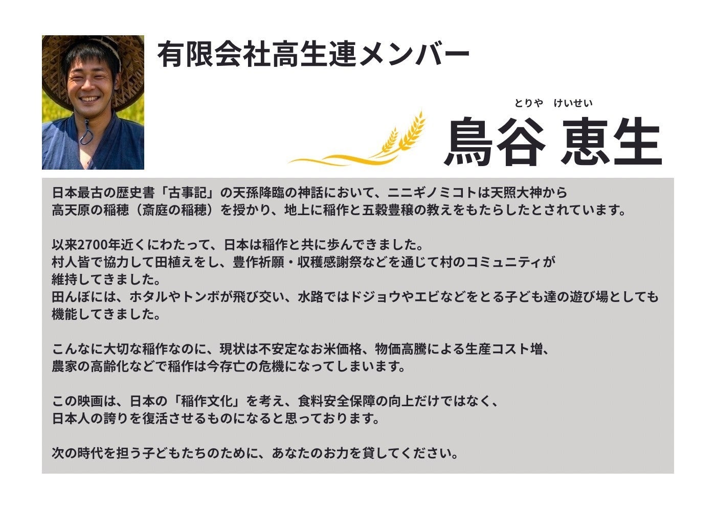 映画館で黄金色の稲穂を共有し、心を揺さぶられた観客が、家族と食卓を囲み、地域での農業支援や、地産地消への参画など、さまざまな形で行動を起こしていく——。その小さな一歩の積み重ねが、やがて日本の大地を潤す大きなムーブメントになります。