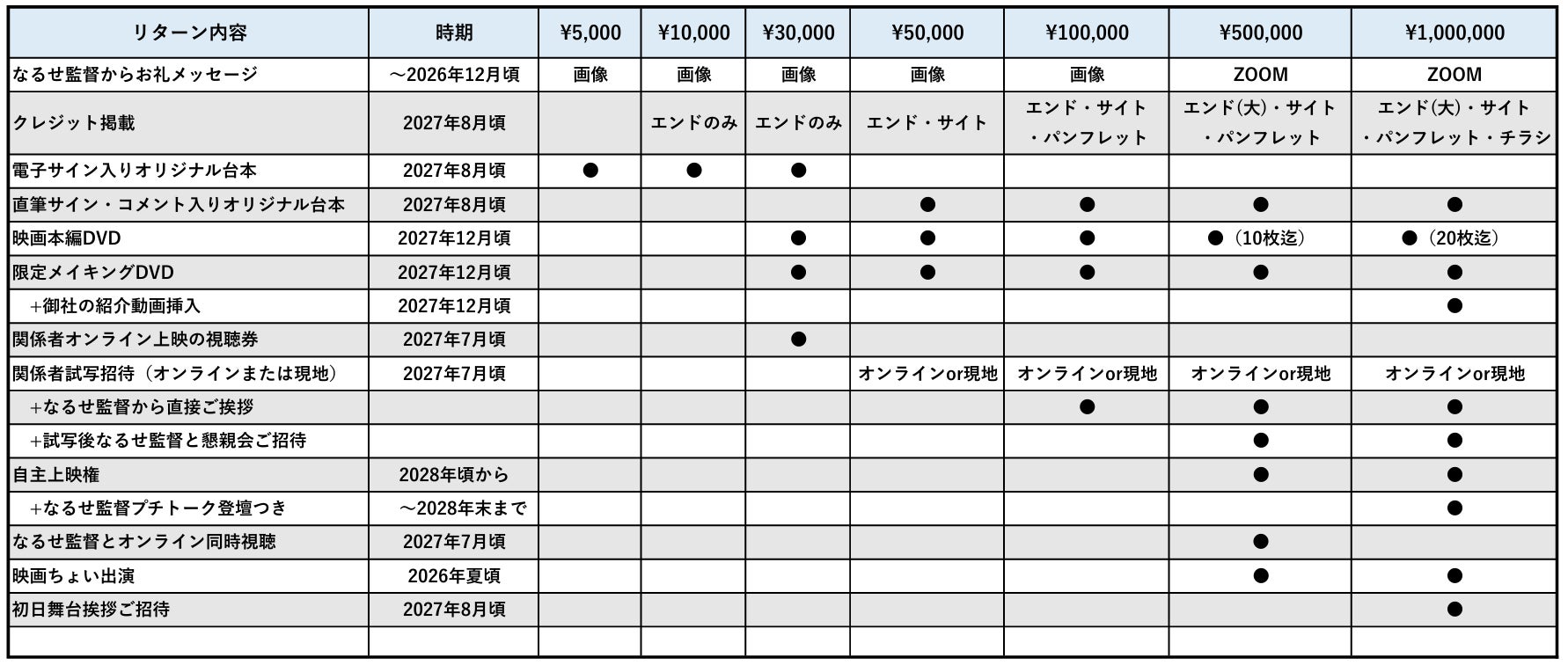 リターンには、お礼のメッセージやエンドロールへのお名前掲載、試写会へのご招待、エキストラ、ちょい役出演、サイン入り台本、さらにはプロデューサークレジットなど、多彩な特典をご用意しました。