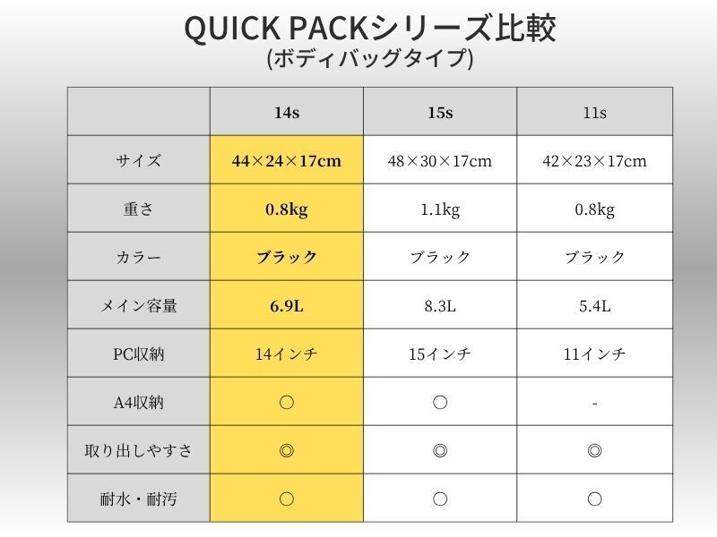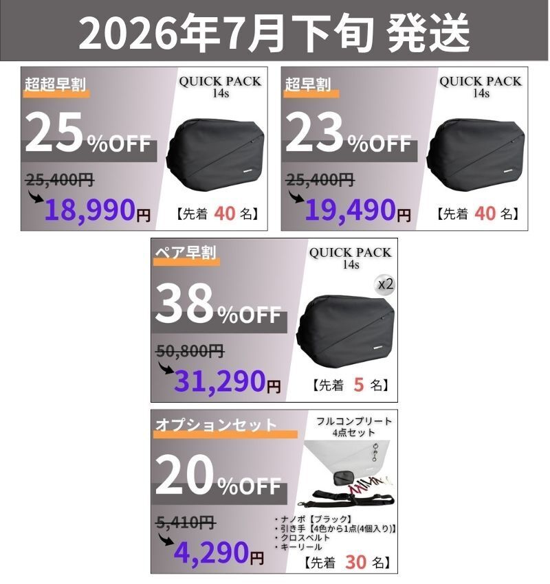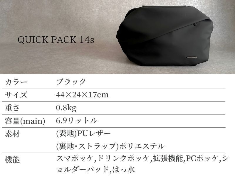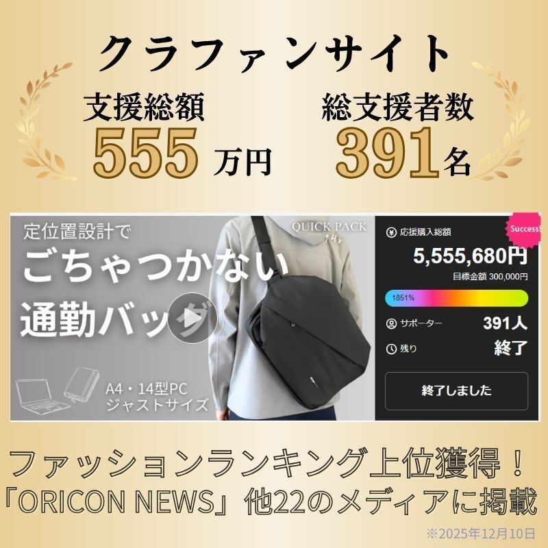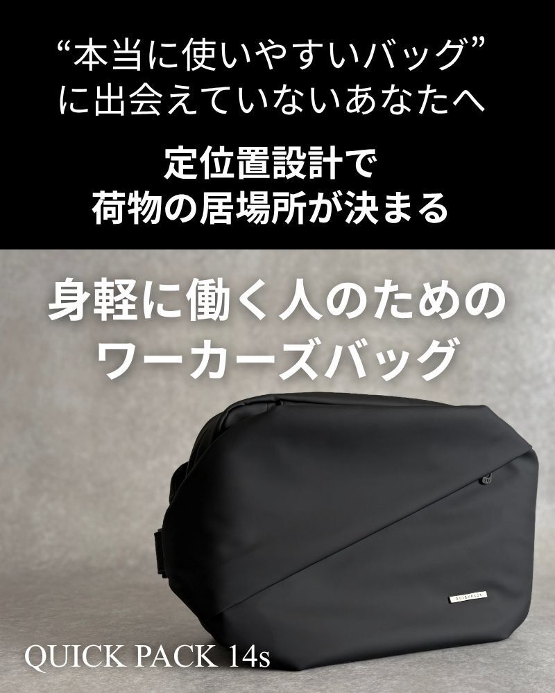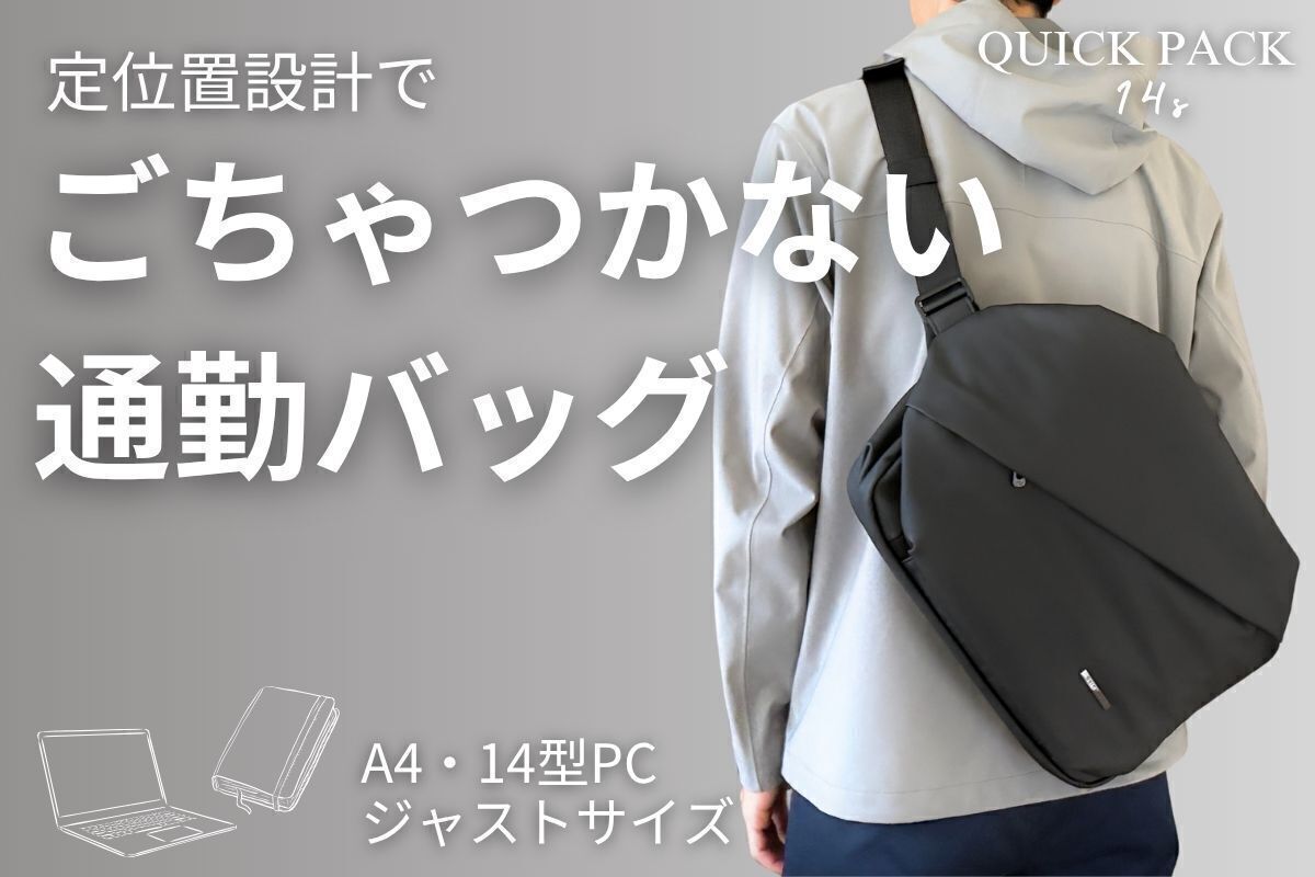 2026/04/21 12:30支援者のみなさまいつもプロジェクトの応援ありがとうございます。本日12時より35,000人のユーザーを抱える人気のQUICK PACK シリーズから、【14インチPC&A4】ジャストサイズの通勤バッグ~QUICK PACK 14s~が公開されました!仕事や何気なく使うことの多い「14型PC」や「A4書類」がピッタリサイズ️。もちろん大きいだけのバッグではなく、・取り出しやすく探さない『定位置設計』・スマホをサッと取り出せる『スマポッケ』・拡張できる『ドリンクポッケ』など、日々の生活を快適にする機能が満載!すでにお使い頂いているユーザー様からは「仕事でもパソコンを持ち歩くので重宝します」「13インチと10インチのPCを2台持ち歩くことが多く、これまでワンショルダーは諦めていましたが、このバッグなら気軽に出かけられます」と高い評価をいただいております。そんな「身軽に働く人のためのワーカーズバッグ」は・最大25%OFF 6,410円割引き・単品プランは先着80名様の数量限定・人気の「オプションセット」もご用意バッグのサイズで悩める方、身軽に気軽に通勤をしたい方、お見逃しなく!≫プロジェクトはこちら もっと見る