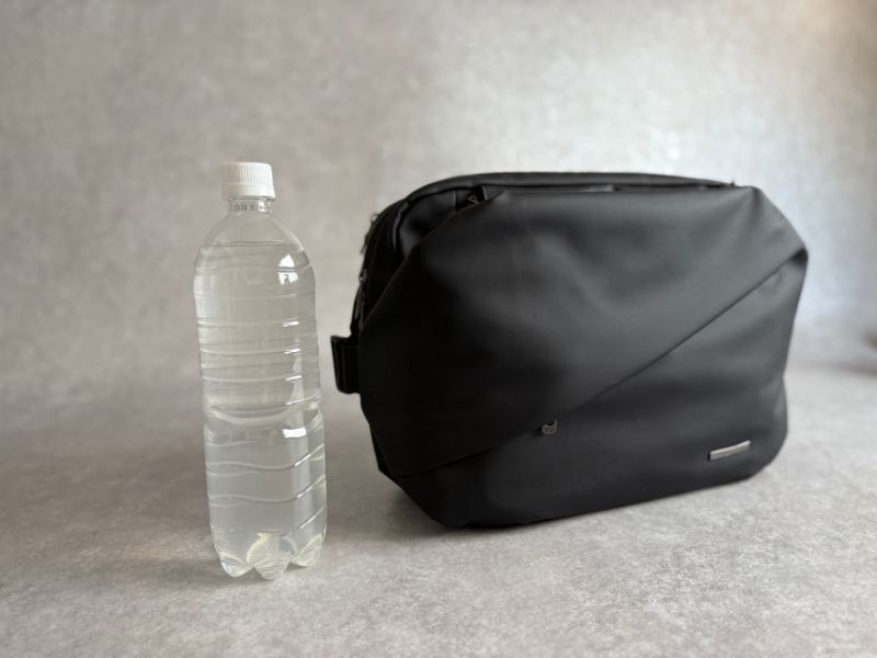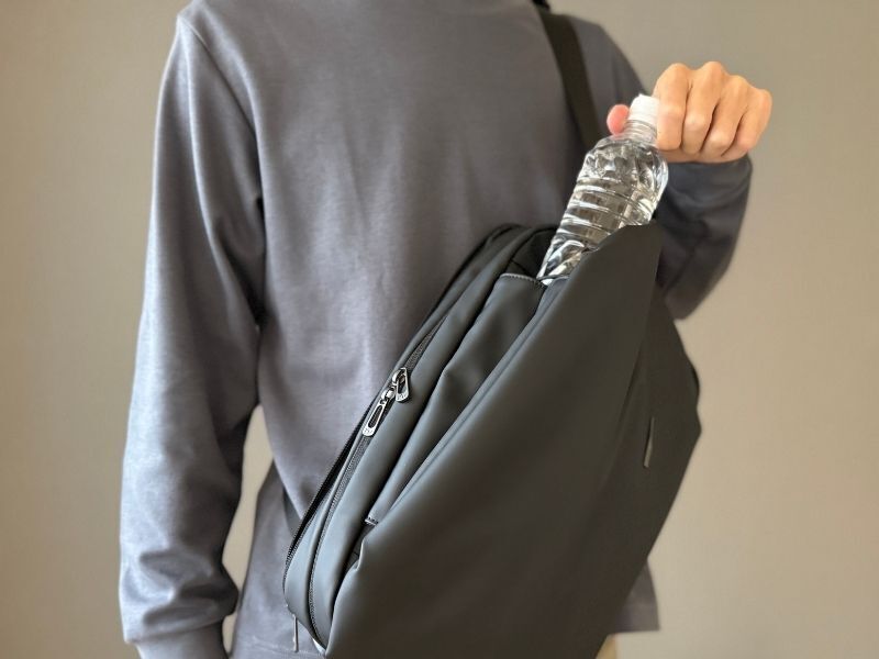 幅は24cm、さらに両側メッシュで拡張性もあるので1Lボトルだって入ります。