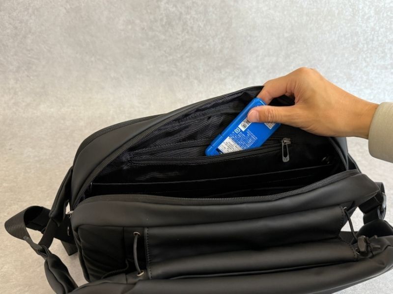 幅34cmのメインポケット、もしくはドリンクポケットに入れて持ち歩くことができます。