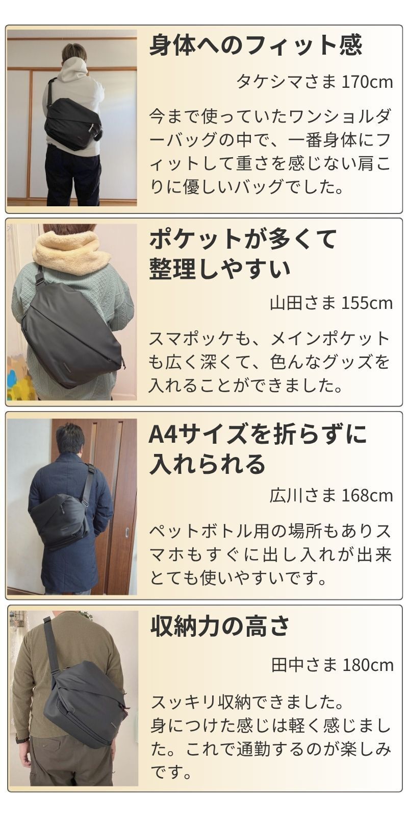 製品が届いたら、手に取り、自分の荷物を入れてみて、背負ってみて、実際に公園まで散歩してみてください。