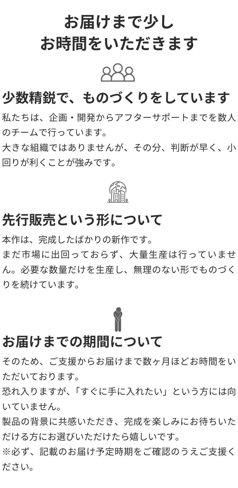 ●引渡し時期: 各リターン詳細に記載の発送予定月を引き渡し時期とします。但し、開発・生産状況によって遅れが生じる場合がありますのでその際は当プロジェクトページ内の「活動報告」または購入者へのメール等で連絡します。