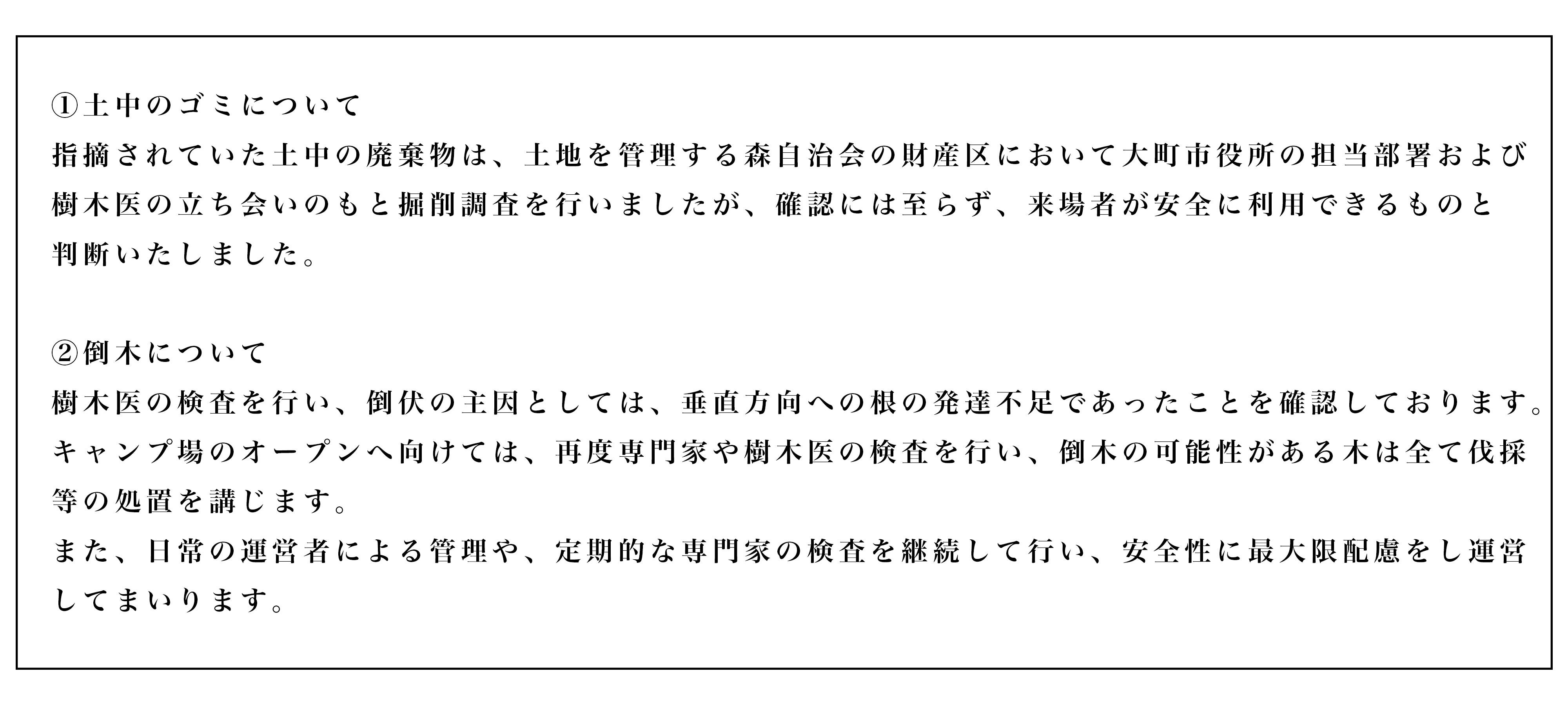 ※営業再開にあたっての樹木医による診断、場内の木の伐採や炊事場の新設は、地元自治区において対応するため、上記必要費用には入れておりません。