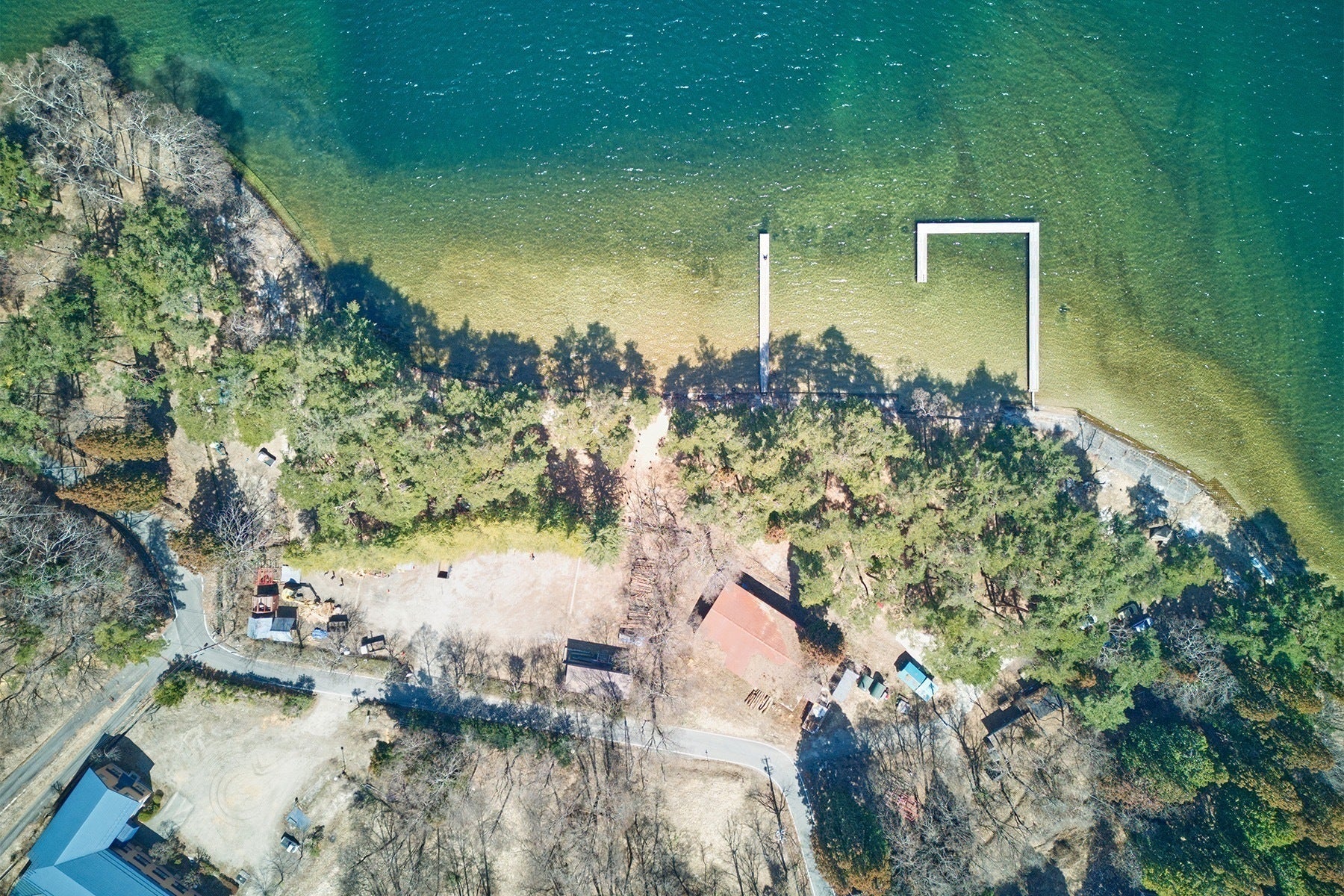 松林を抜けた先にある、透き通る湖と、開けた山と空の景色。