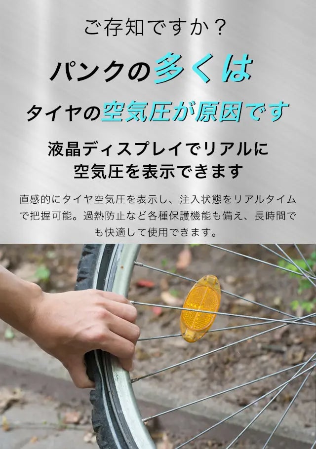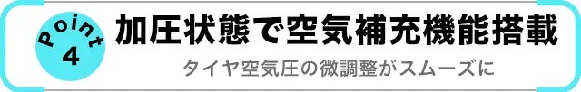 また、加圧状態での再始動が可能で、タイヤ圧の微調整もスムーズに行える便利な機能を搭載。ディスプレイや自動停止機能なども充実しており、作業効率を大幅に向上させ、サイクリングをより快適にサポートします。