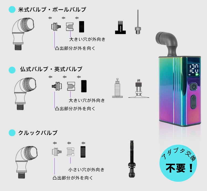 さらに、革新的な設計により面倒なノズル交換は不要!米式・仏式・英式に加え、シュワルベ「クリック式バルブ」やボールにも対応した5in1一体型ノズルを搭載し、これ1台で幅広いシーンに対応します。