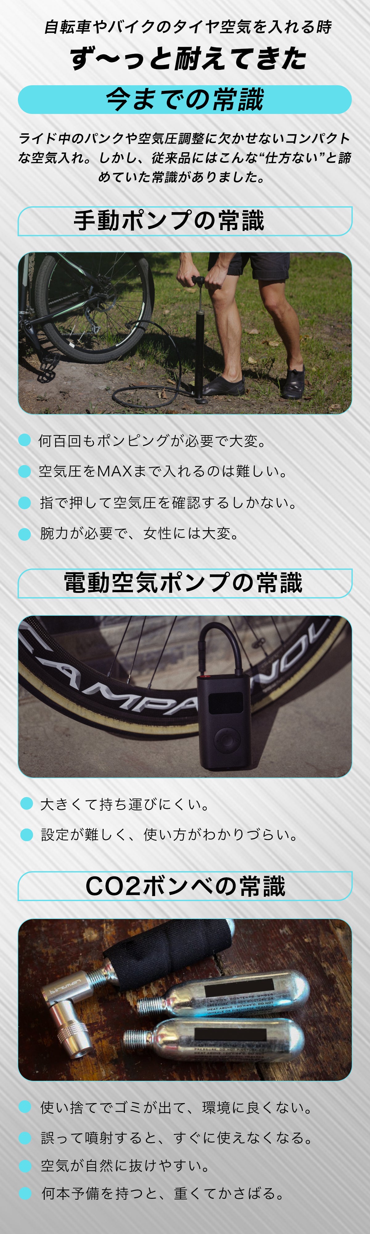 私たちは、日常の中で「空気入れが大きくて持ち運びに不便」「いざという時に空気入れが見つからない」「小型のものはパワーが足りない」といった悩みを何度も経験してきました。出先で空気圧が足りないタイヤや、アウトドアシーンでのちょっとした空気補充の必要性など、誰もが一度は感じたことのある「困った」を解決するため、Tirepowerは誕生しました。