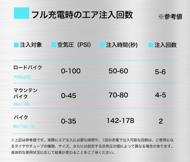 フル充電でロードバイク(700×25C・100PSI)のタイヤ最大約6本分に空気を充填可能!